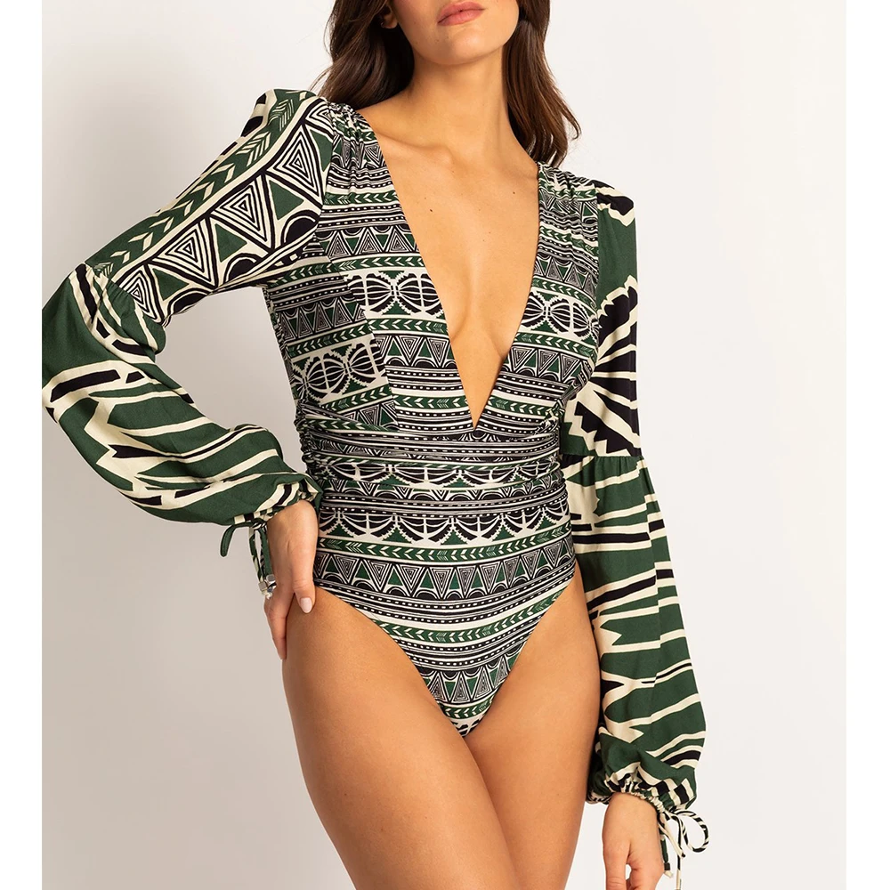 Новинка 2022, цельный купальный костюм с геометрическим принтом, женская сексуальная купальная одежда с глубоким V-образным вырезом, женский купальный костюм с длинным рукавом, пляжная одежда для плавания, для дам XXL