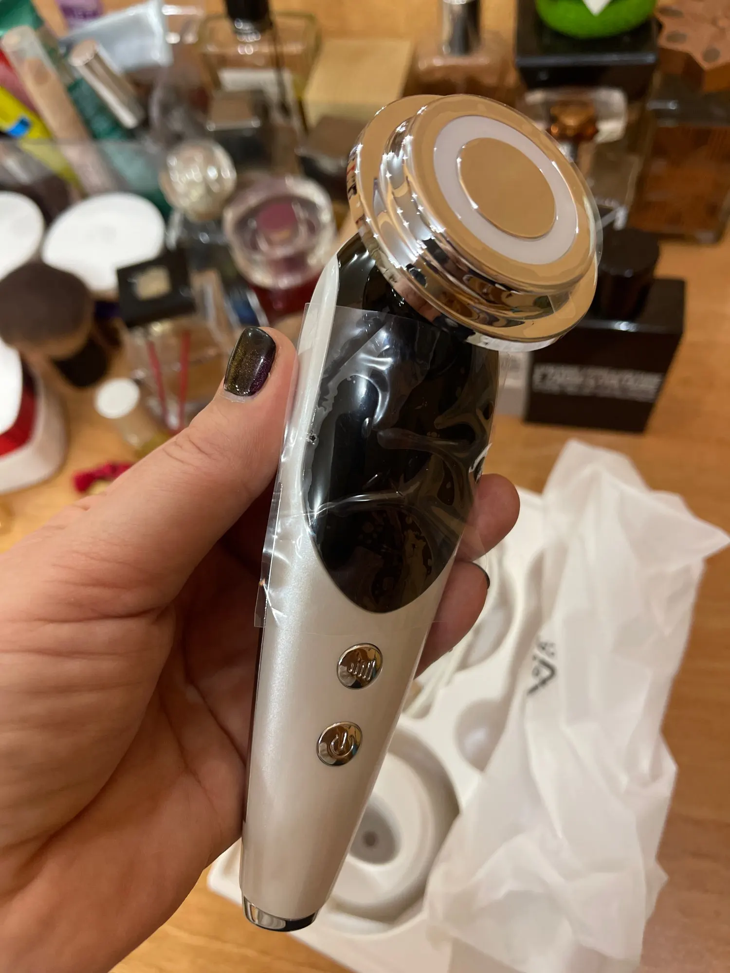 Это косметическое устройство для лица с EMS микро-током (гальваническими ионами), теплыми вибрациями