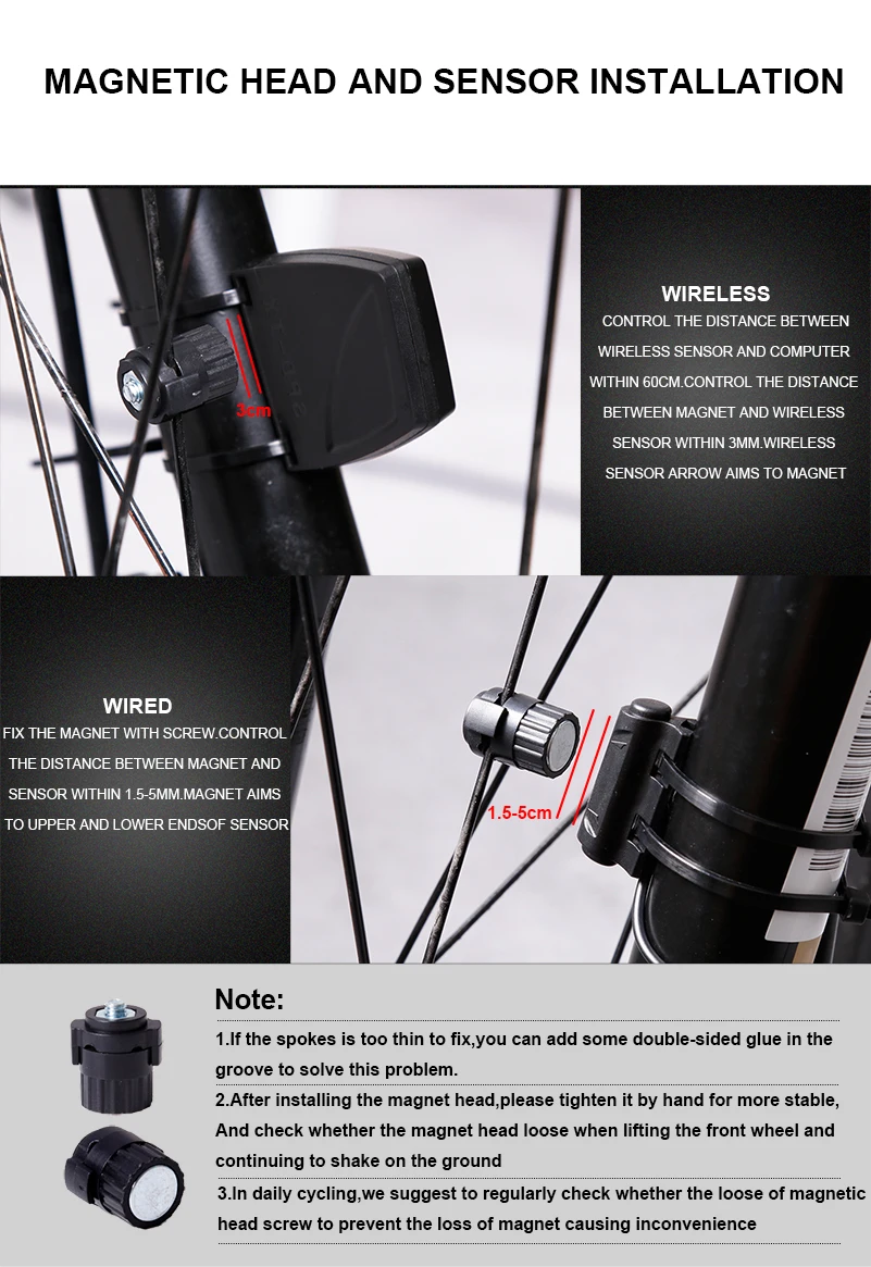 Датчик и MagnetInstallationУстановите датчик на переднюю вилку велосипеда, и Магнит устанавливается на стальную проволоку с той же стороны колеса. Датчик может быть нанесен на заднюю панель и с помощью ремня крепится на переднюю вилку.