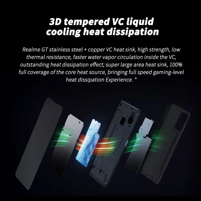 Realme GT та же нержавеющая сталь + медь VC теплоотвод, высокая прочность, низкое тепловое сопротивление, более быстрая внутренняя циркуляция водяного пара в VC, отличный эффект рассеивания тепла; Супер большая площадь теплоотвода, 100% полное покрытие основного источника тепла, обеспечивает полную скорость Игрового уровня отвода тепла. *