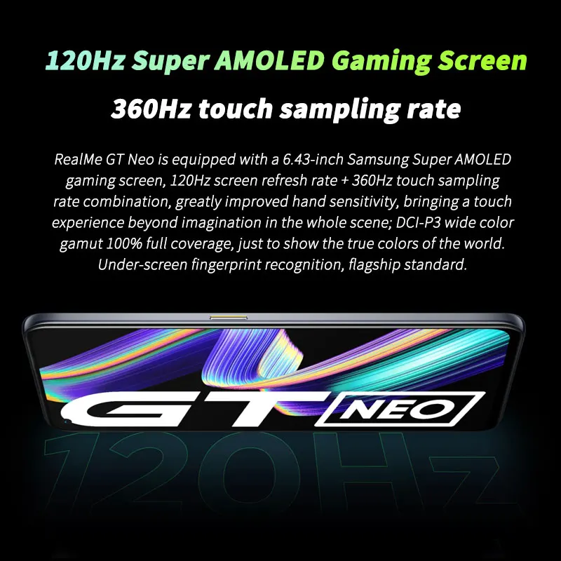 Realme GT Neo оснащен сенсорным дисплеем 6,43 дюйма Samsung Super AMOLED из компьютерных игр, 120 Гц частота обновления экрана + 360 Гц сенсорный частота дискретизации комбинация, значительно улучшена ручной чувствительность, принося сенсорный опыт за рамки воображения во всей сцене; DCI-P3 широкий цветовой охват 100% полного покрытия, просто чтобы показать истинные цвета мира. Распознавание отпечатков пальцев под экраном, флагманский стандарт.