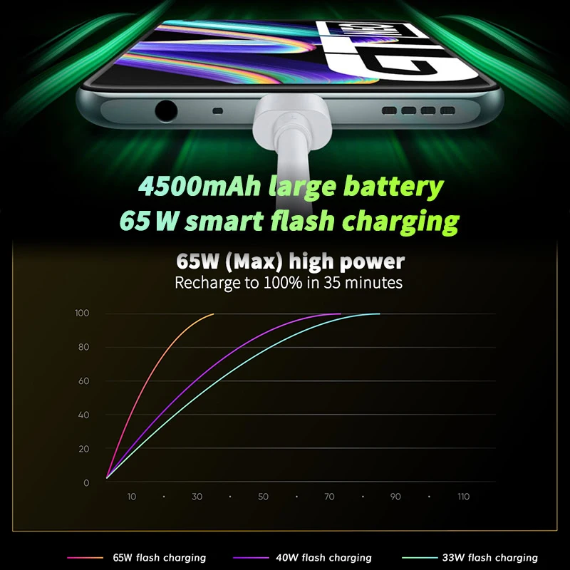 65 Вт умная Зарядка для вспышкиRealme GT Neo flash версия обновлена до 65 Вт (макс.) умная зарядка вспышки, что обеспечивает вам максимальный опыт зарядки. Большой аккумулятор емкостью 4500 мА · ч может быть заряжен до 100% всего за 35 минут, и кровь вспыхнет в критические моменты. Интеллектуальная пятижильная защита, зарядка от вспышки во время игры, безопасная и не Горячая *.