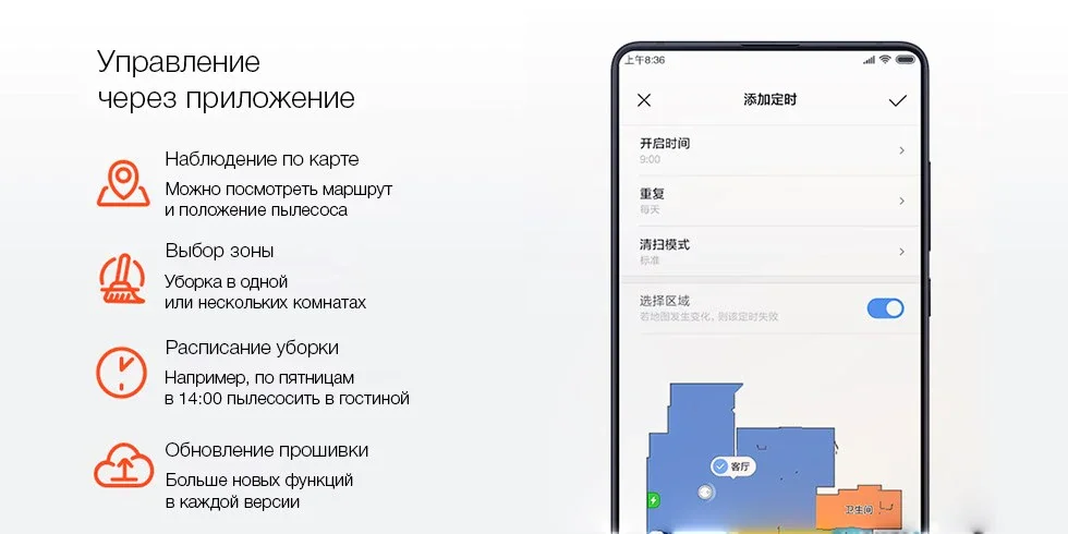 Дополнительная информацияПоддержка Mi Home; Управление со смартфона; Построение карты помещения; Расчет времени уборки; Уборка по расписанию; Автоматическая установка в ЗУ