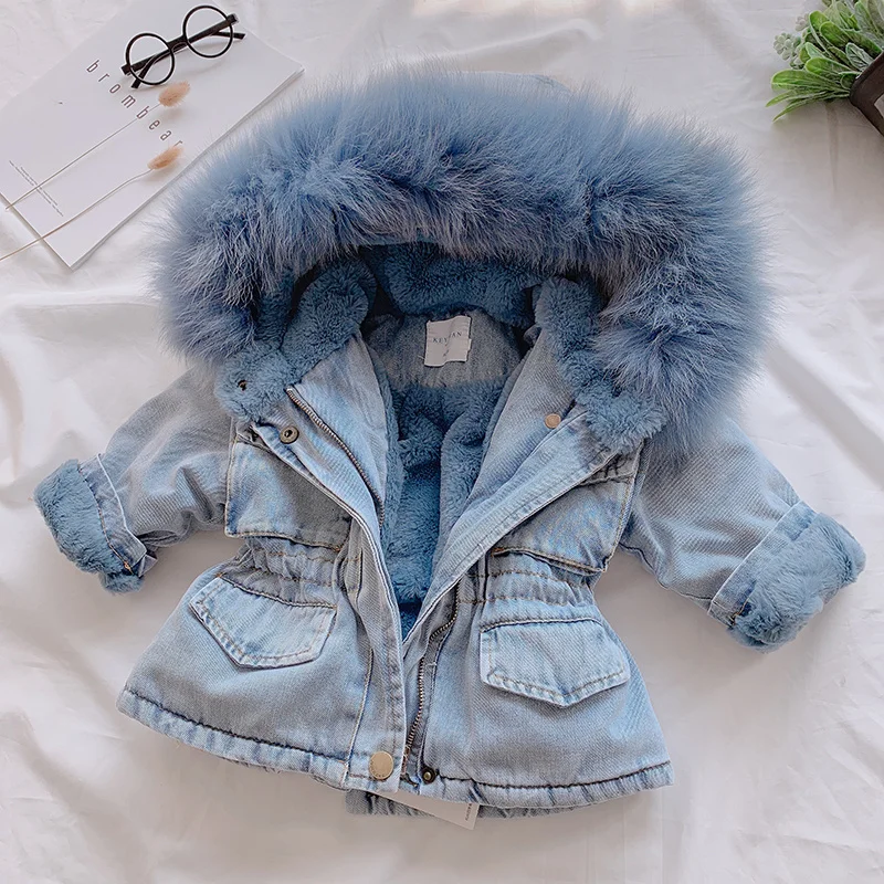 Зимняя джинсовая куртка для маленьких девочек с мехом, теплая верхн...
