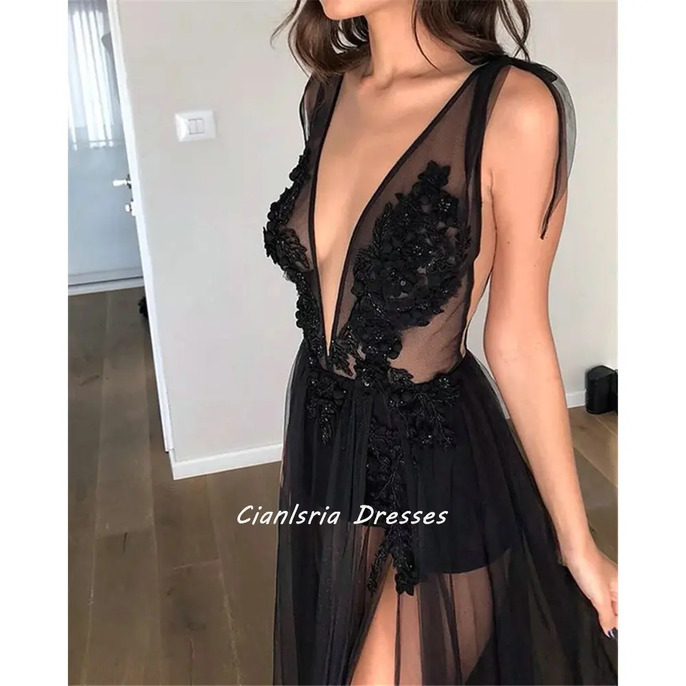 Черный сексуальный комбинезон с глубоким V-образным вырезом, вечернее платье без рукавов с высоким разрезом, женское платье для выпускного вечера