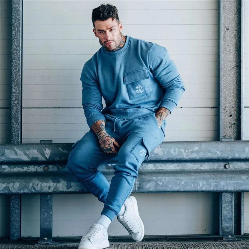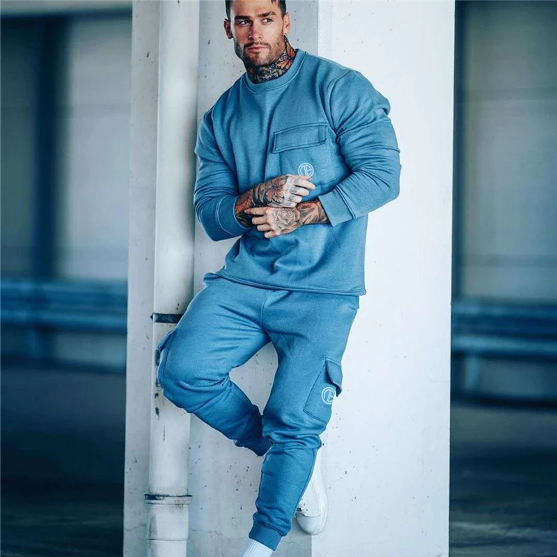 Мужской спортивный костюм для фитнеса, рабочая одежда, мужской костюм на осень и зиму, рубашка с длинным рукавом + брюки, спортивный костюм для тренажерного зала и бега, хлопок