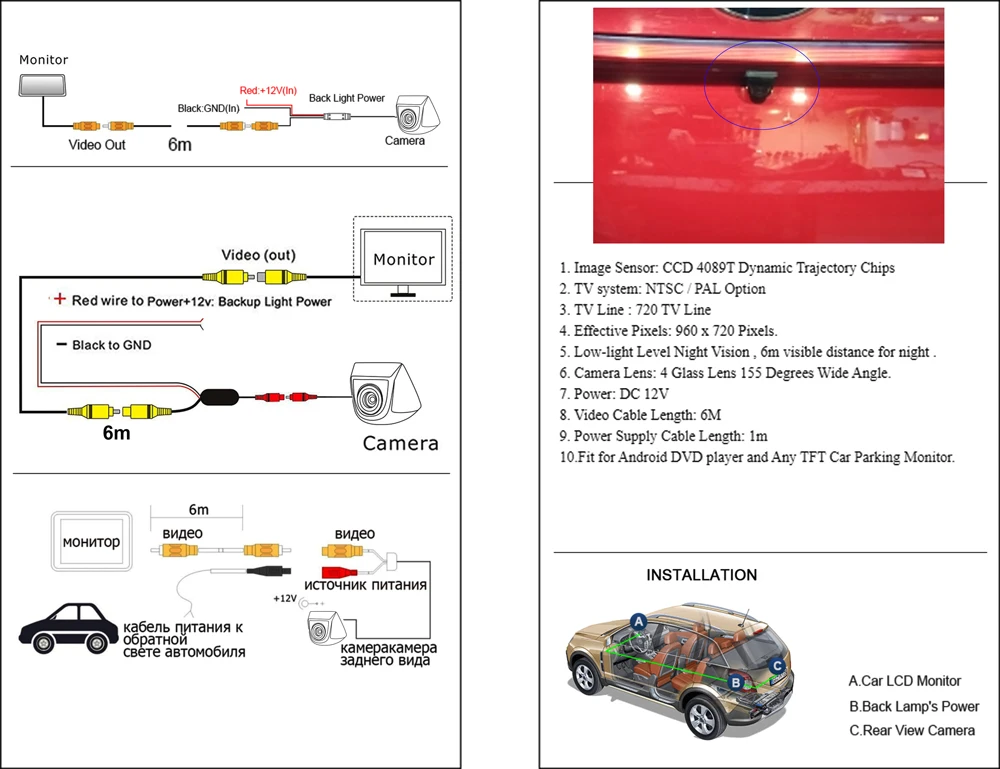 *** Примечание: Если монитор android dvd или стерео радио, вам нужен кабель 6 м красный триггер провода A и B:Соединительный обратный светильник мощностью DC12V +.B Подключите к проводу запуска DVD.