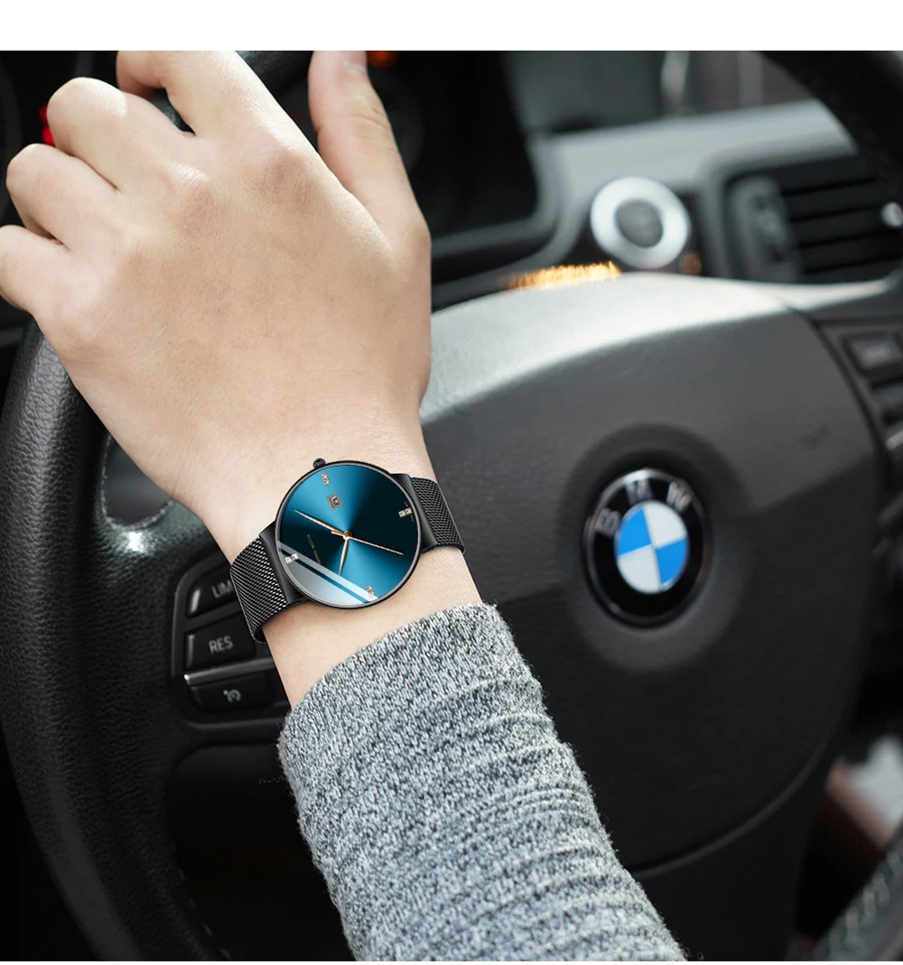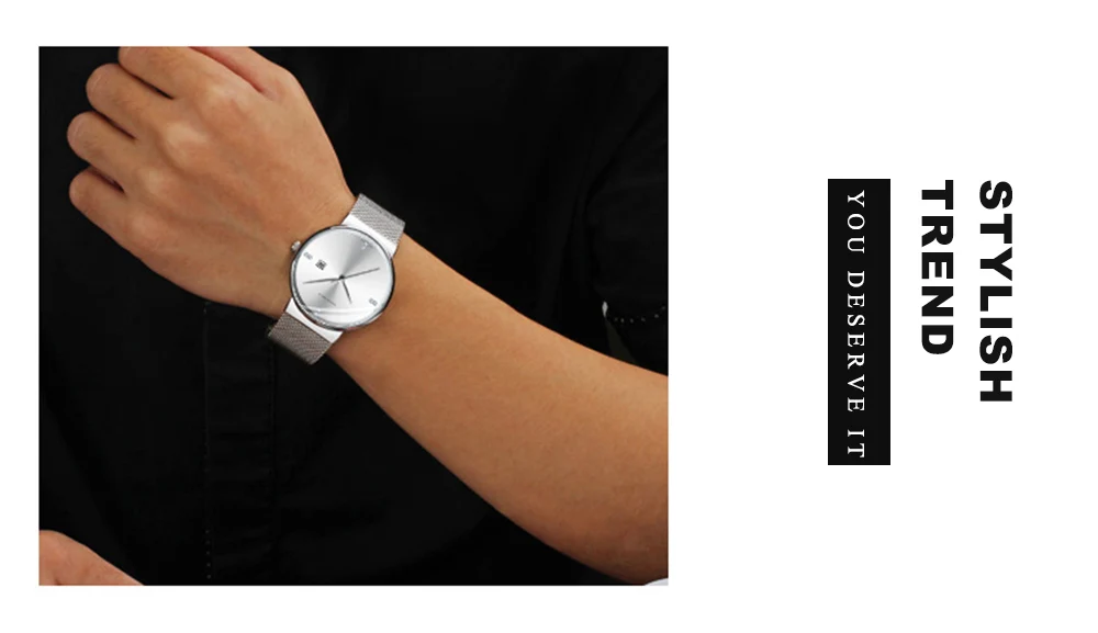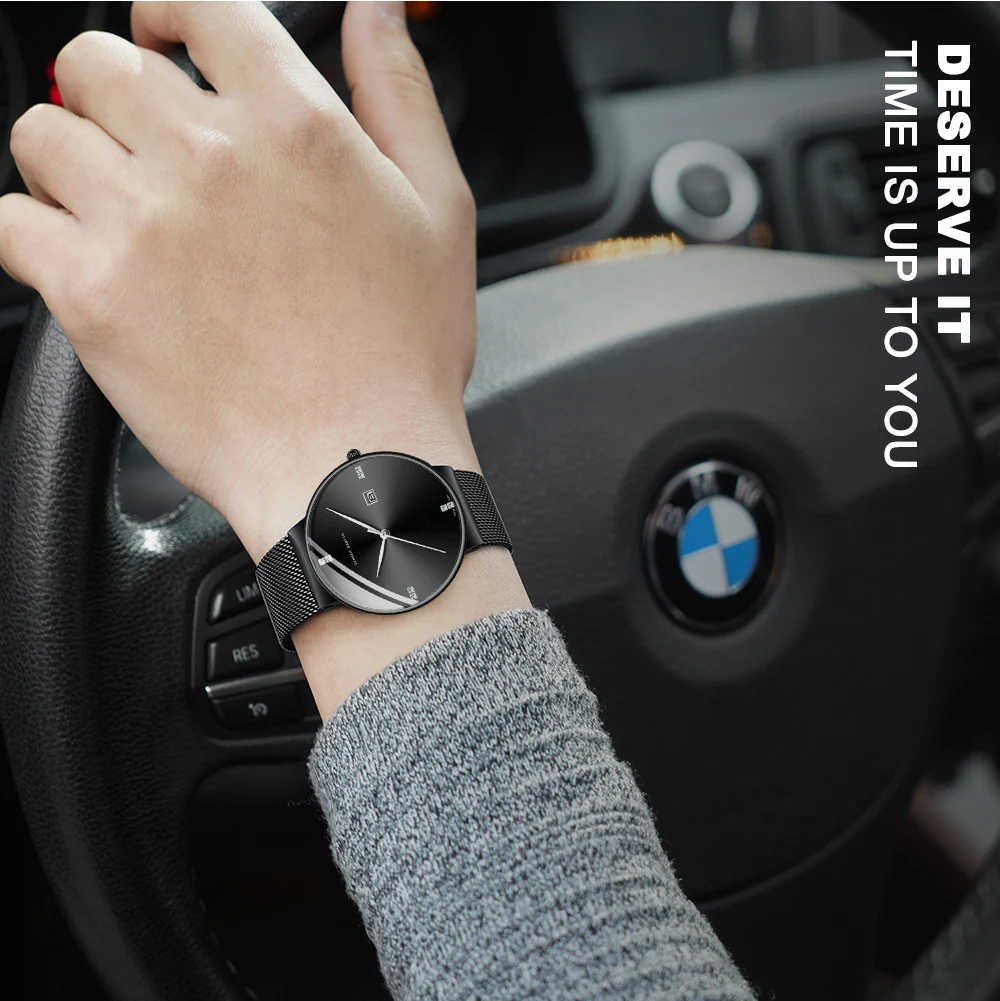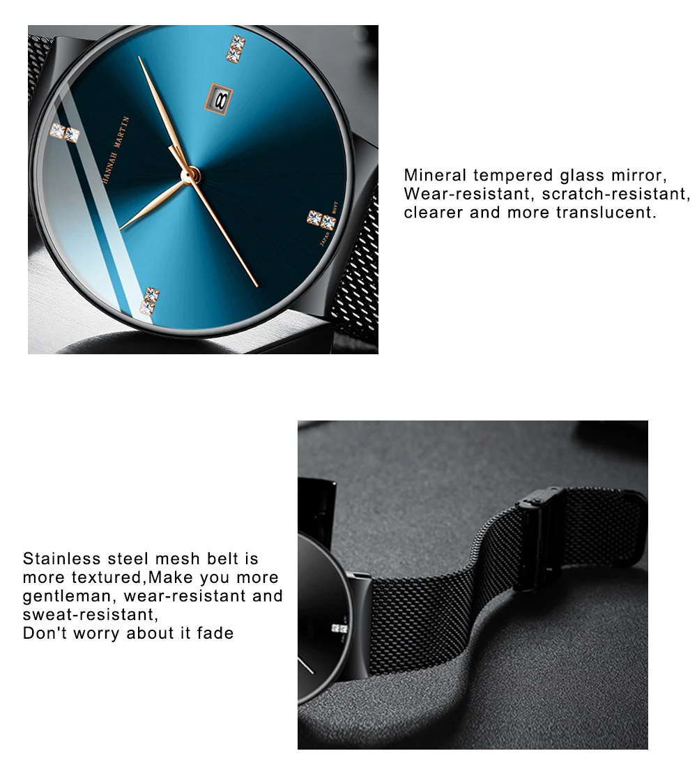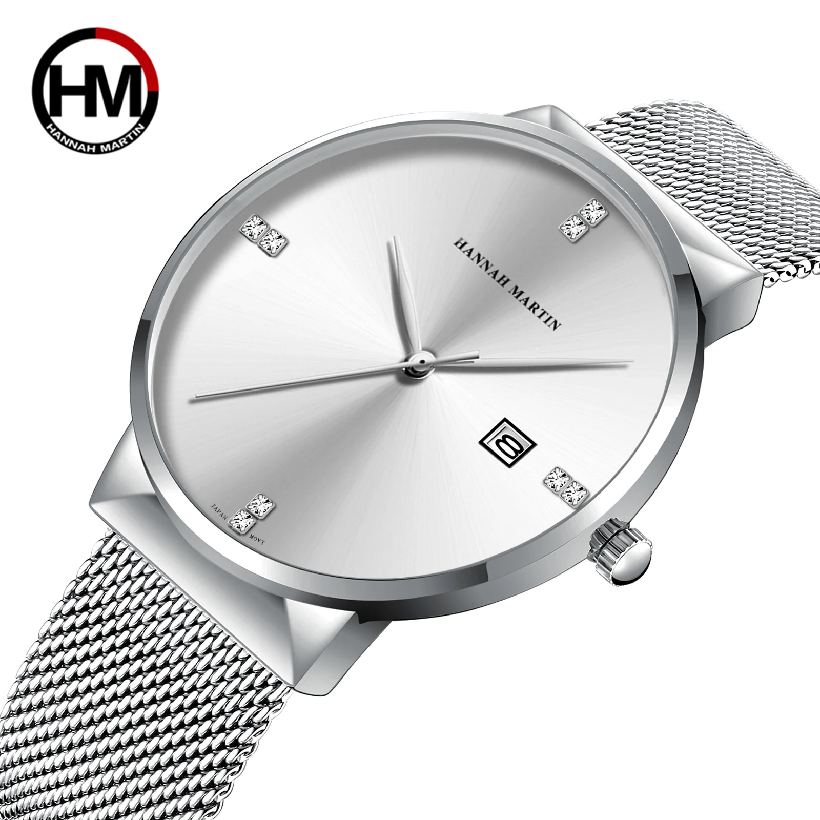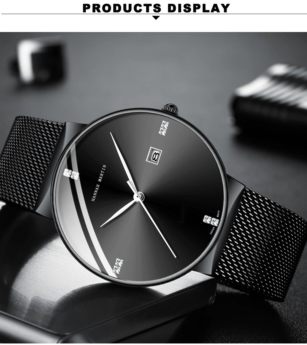 Часы Hannah Martin Мужские кварцевые ультратонкие, модные повседневные водонепроницаемые спортивные, с сетчатым стальным ремешком, черные