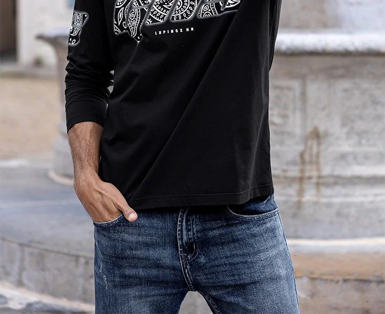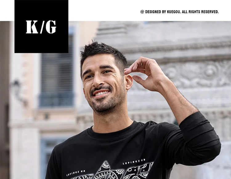 Мужская футболка с длинным рукавом KUEGOU, черная футболка с длинным рукавом, украшенная принтом, лето 2021
