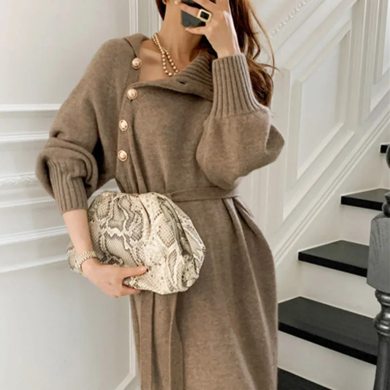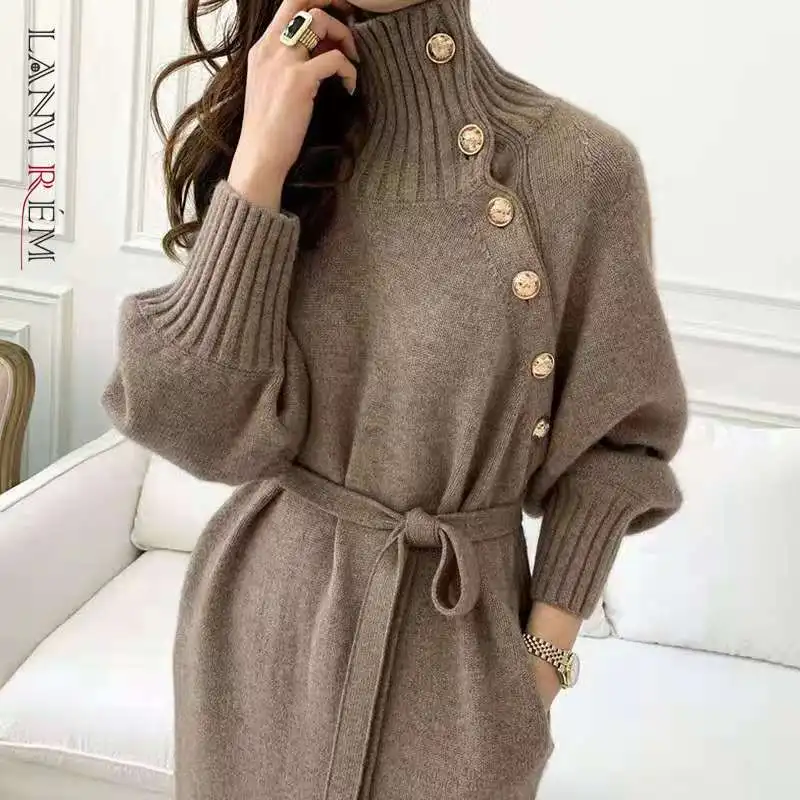 LANMREM вязаное платье для женщин 2022 осень и зима новое платье с высоким воротом Бандажное платье с пуговицами на талии женское элегантное 2C506