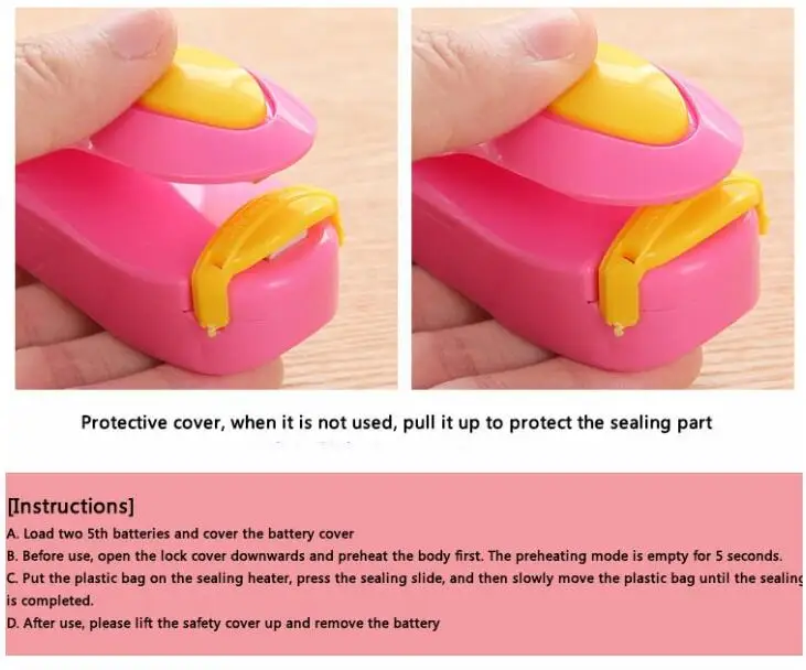 Название: соответствие ярких цветов мини-машина для запечатывания Материал: АБС-пластик + Проволока Размер: около 10*4*5 см Вес: около 60 грамм Цвет: синий, желтый, розовый, белый, фиолетовый Упаковка: многослойная пенопластовая упаковка Как использовать: Откройте крышку, чтобы разогреть изделие, нажав 5 секунд перед использованием. Вы просто проденете его по краю любого пакета, и он герметично закрыт Примечание: на задней части оригинального уплотнительного зажима есть магнит для притяжения холодильника. Однако из-за ограничений авиационной логистики на магнитах, мы вынуждены снимать магниты, поэтому товары, которые вы покупаете сейчас, не содержат магнитов, надеемся на понимание.