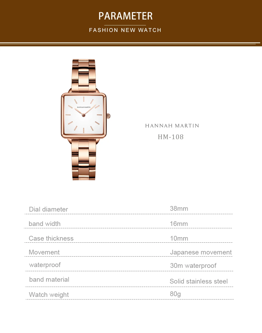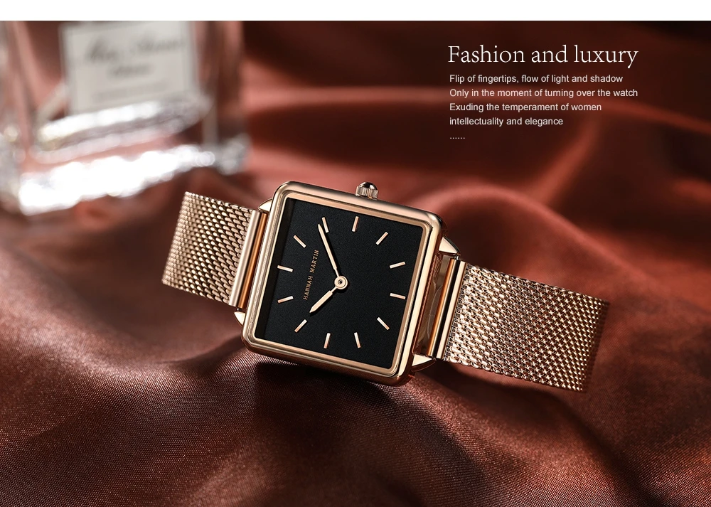 Часы Hannah Martin женские с японским механизмом, Простые Модные Повседневные Роскошные брендовые наручные, квадратные, розовое золото, Прямая поставка