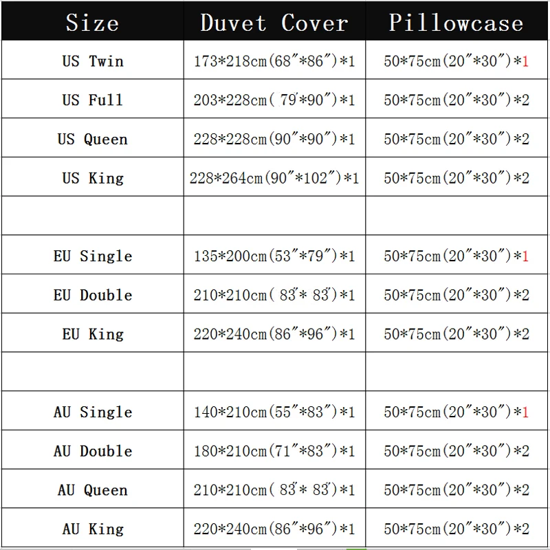 Материал: Mikrofaser Doppel nadeln nähen rand Druck Technologie: 3D digitalduck Wir bieten UNS EU UK AU grüsen, vüllig 14 grüsen. Сие кённен юберпрюфен дeргeссе фoто ЗУ вэхлен, была Sie wollen. Hinweis: 1. damit messung 1-4 см (0,39-1,57 дюйма) fehler ist zulässig. 2. diese bettwäsche set nicht enthalten jede tréster oder füllung. 3. aufgrund fern verschiffen, die bettwäsche set kann ein wenig faltig, es ist normal. 4. nicht tränken waschen в heizer wasser, die richtige temperatur ist unter 35 grad по Цельсию. 5. Набор abdeckung ohne trøster, nur abdeckungen. 6. paket: UNS Twin/UK Einzel/AU Einzel sind 2 teile/satz (1x bettbezug, 1x kissenbezug) Andere grésen sind 3 teile/satz (1x bettbezug, kisbeg) описание продукта 100% абсолютно новый и высокое качество. Цвет: как на изображении. Материал: хлопок/полиэстер. Таблица размеров: