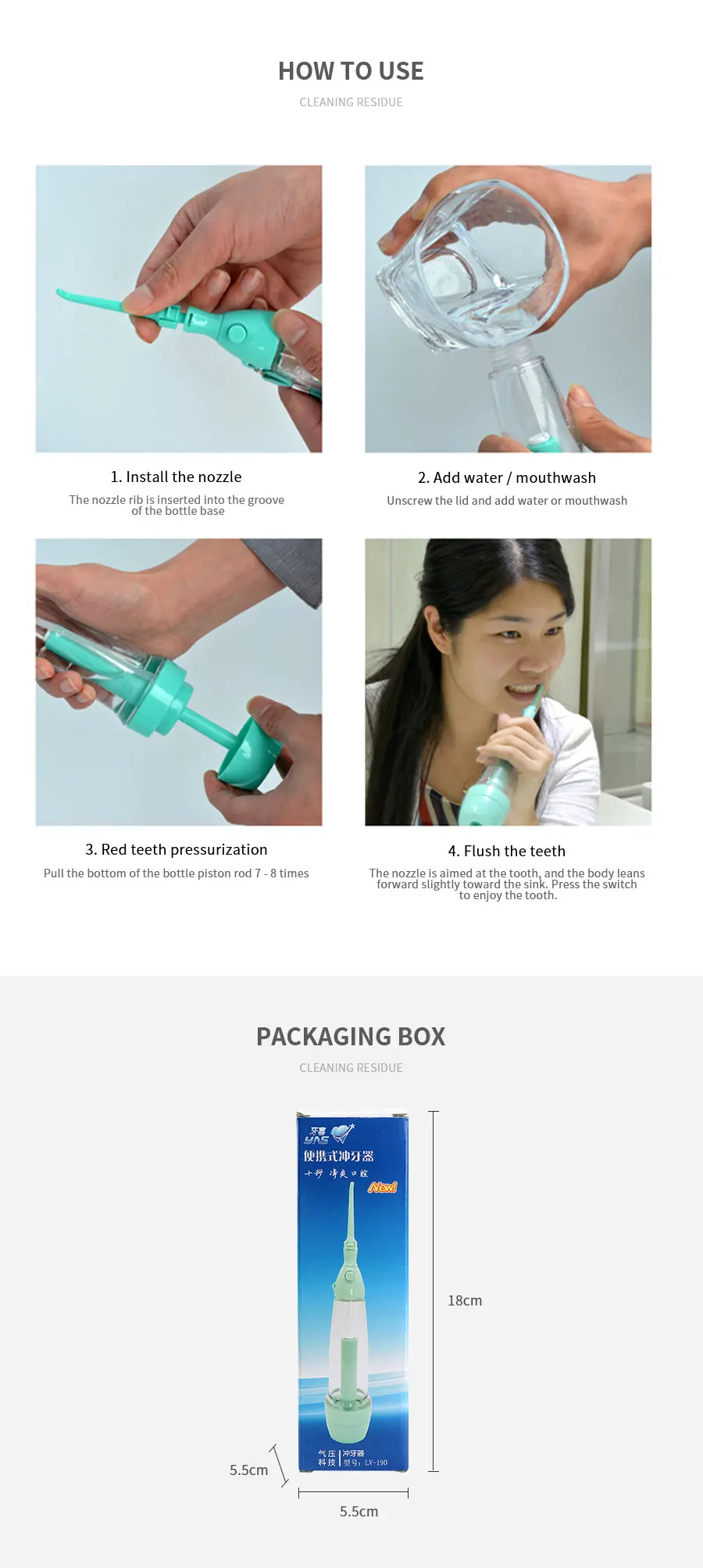 1,120 ° дизайн локтяСоответствует чистке десны для защиты здоровья десны2. Дизайн одной кнопкиС гентальным прессом, струей воды3. Ручной Тяговый стерженьРучная откачка, впрыска воздуха, генерация сильной воды4. Гибкая пряжкаЛегко носить и прочный
