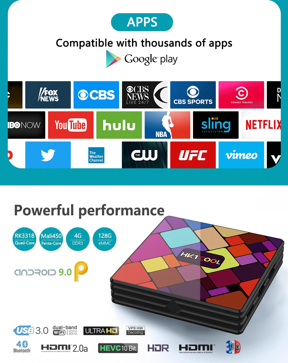 ◆ Чипсет RK3318 четырехъядерный 64 бит Cortex-A53◆ GPU пятиядерный Mali-450Вспышка EMMC 16G/32G/64GB◆ SDRAM 2G/4GB◆ USB 1 Type-A USB3.0,1 Type-A USB2.0◆ LAN Ethernet:10/100M стандарт RJ-45◆ Беспроводной 2,4G /5G двухдиапазонный Wi-Fi 802,11 a/b/g/nУстройство чтения карт Micro SD, максимальная поддержка 64 ГБ◆ DisplayPort HDMI◆ HDMI 2.0a для 4k @ 60 Гц◆ Индикатор питания светодиодный Питание: синий; Режим ожидания: красный◆ Удаленный ИК◆ Вход источника питания: 100-240 В, Гц Выход: 5 В постоянного тока/А◆ Поддержка AV◆ Рабочая температура ﹣ 10 ℃ до 45 ℃◆ ОС Android 9,0◆ Поддержка формата декодера "видеодекодер 4K VP9, видеодекодер H.2641080P другие видеодекодеры (VC-1, MPEG-1/2/4, VP6/8)"◆ Поддержка медиа-форматов Avi/Ts/Vob/Mkv/Mov/ISO/wmv/asf/flv/dat/mpg/mpeg◆ Поддержка музыкального формата MP3/WMA/AAC/WAV/OGG/DDP/HD/FLAC/APE◆ Поддержка формата фото HD JPEG/BMP/GIF/PNG/TIFF◆ HDD файловая система FAT16/FAT32/NTFS◆ Поддержка субтитров сто/SMI/SUB/SSA/IDX + USB◆ Видеовыход высокой четкости 4K (3840x2160 пикселей)◆ OSD тип языков английский/французский/немецкий/испанский/итальянский/и т. Д. Многосторонние языки◆ Мышь/клавиатура с поддержкой мыши и клавиатуры через USB; Поддержка беспроводной мыши и клавиатуры 2,4 ГГц через USB-ключ 2,4 ГГцСпецификации программного обеспечения◆ Сетевые функции KODI 18,1, Neflix,Vudu,Skype в чате, Picasa,Flicker,Youtube,Facebook, онлайн-фильмы и т. д.◆ Другие функции: бесплатный поиск в Интернете, тысячи приложений для android, множество видов игр и т. Д.◆ Сертификация CE,FCC,ROHS◆ Аксессуары адаптер питания, кабель HDMI, руководство пользователя, пульт дистанционного управленияПоддержка мыши и клавиатуры через USB; Поддержка беспроводной мыши и клавиатуры 2,4 ГГц через USB-ключ 2,4 ГГц,