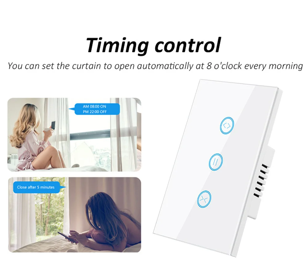 Сенсорная кнопка: пауза/открытие/закрытиеПульт дистанционного управления: пауза/открытие/закрытиеПроцент открытый/закрытый занавес: 0-100%График времени/таймеры/семейный обменГолосовое управление через Amazon Alexa,Google homeСертификация: CE,Rohs,FCC