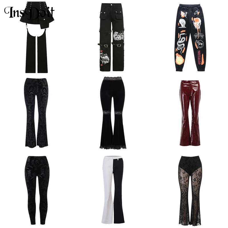 Женские бархатные брюки InsDoit, черные винтажные штаны в стиле Харадзюку, с кружевами, с высокой талией, в готическом стиле