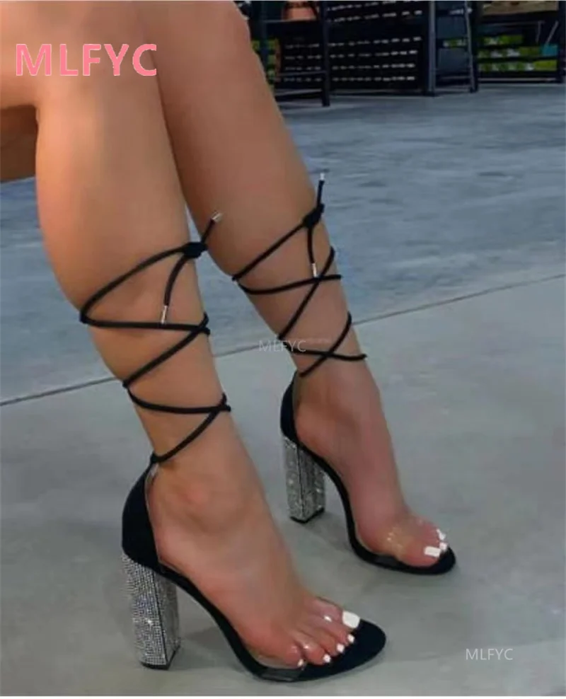 Сандалии на толстом каблуке Новинка Лето 2021 пикантная женская обувь на высоком каблуке с кружевом сандалии на каблуке со стразами на прозрачном каблуке для женщин