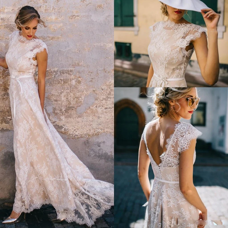 Винтажное кружевное богемное свадебное платье цвета шампанского 2020 А-силуэт с рукавом-крылышком и открытой спиной с бантом и поясом свадебное платье