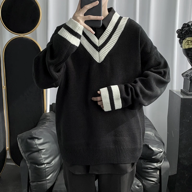Мужской Трикотажный Свитер оверсайз, Повседневный пуловер контрастных цветов с V-образным вырезом, одежда для осени и зимы, 2021