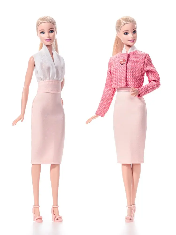 В целом понравилось. Жакет для Миззи широковат и плохо сидит сидит в груди. Пришлось подгонять и делать вытачки. На Барби село все отлично просто. Пошито хорошо. Ткань хорошая, прям как у настоящих "человеческих" жакетов, такая чуток грубоватая, рельефная. Платье в качестве платья не очень. Там пришита белая тянущаяся ткань, которая на кукле сидит мешком. Что на Миззи, что на Барби. Надо что то придумывать- подшивать, или разрезать петлю и делать завязки. И сама ткань прям дешман. А вот у юбки платья ткань клевая,плотная, красивая. Я в итоге на обоих плптьях отчекрыжила этот верх дурацкий и получились прекрасные юбки с завыш талией. В общем в итоге у меня вышло два юбочных костюма. Продавец положил еще в подарок туфельки. Спасибо ))