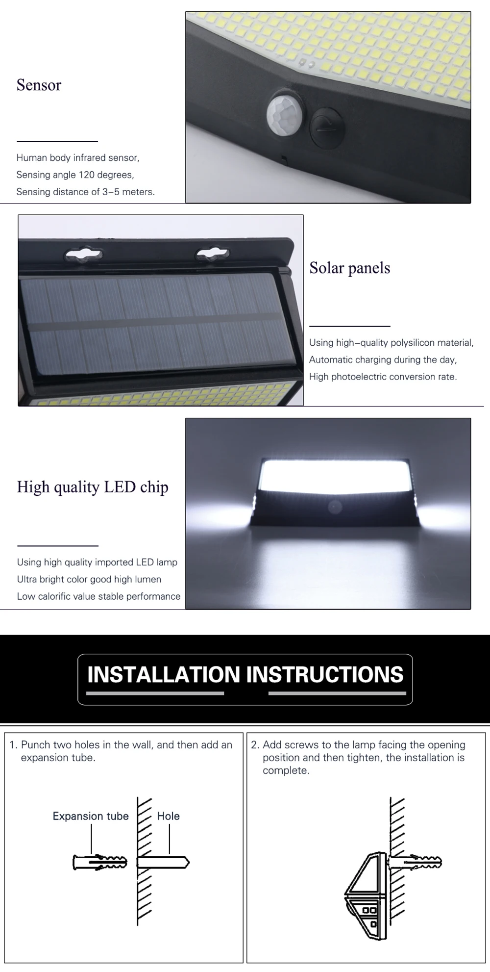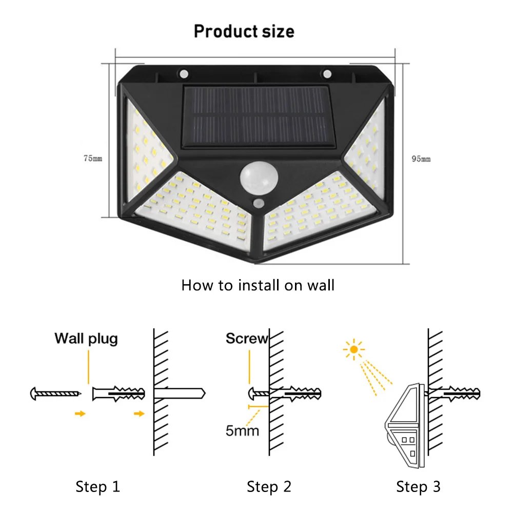 5. Питание от солнечной энергии: солнечная панель находится в верхней части лампы. Он автоматически хранит электричество в течение дня. Пожалуйста, установите продукт в месте прямого солнечного света. Этот уличный солнечный светильник беспроводной. Вы можете установить его на стену