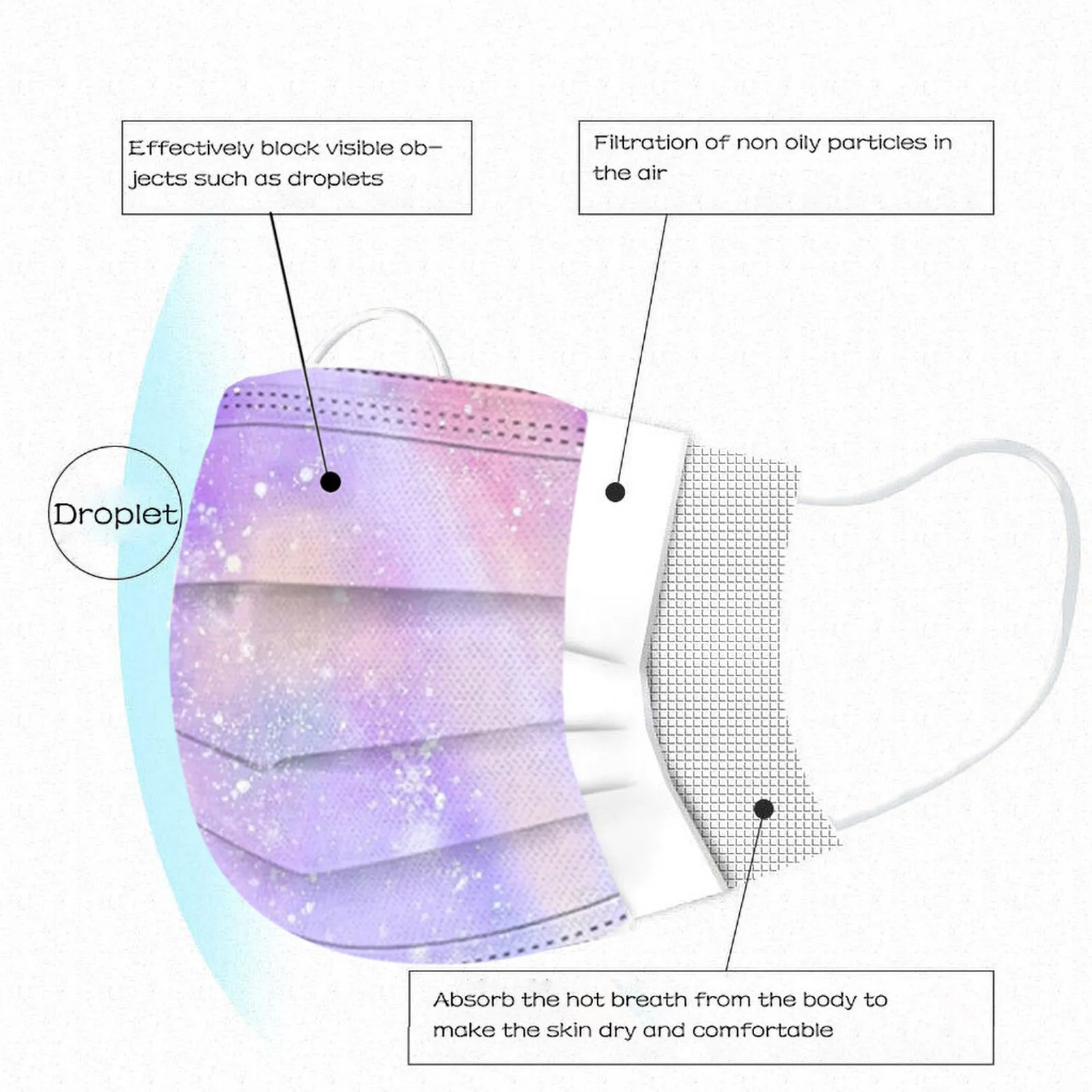 В 3 слоя Нетканая одноразовая маска изготовлена из 3 слоев нетканого материала, Безопасен и безопасен для использования. Дышащий материал и милый Узоры, которые делают его полезным и модным. Специальный 3 слоя из нетканого материала Дизайн, обеспечивает некоторую защиту от пыли, автомобильных выхлопных газов, Пыльца и т. д. эластичная Ушная петля, легко носить и не давит на уши. Маникюрный салон или любые другие области, где может потребоваться защита