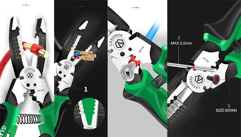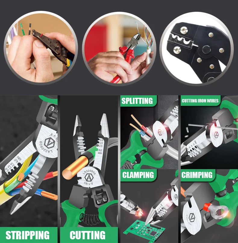 1. Шесть-в-одном многофункциональный дизайн, зажим, резка, зачистка провода, резка провода, разделительная проволока, обжимной терминал 2. Cr-v стальная ковка, высокочастотная закалка, твердость 58 ± 2, острый и прочный 3. Нескользящая двухцветная ручка, удобная и красивая в руке 4. Диапазон зачистки: 1,0/1,5/2,5/4,0 мм