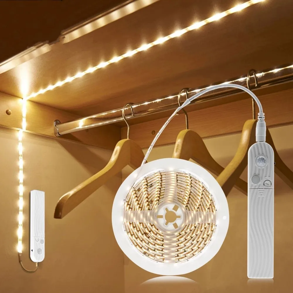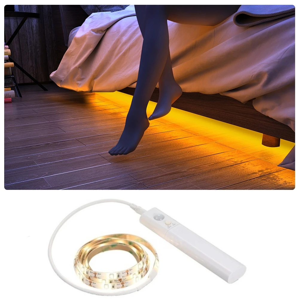 Лента с датчиком движения, чувствительная Светодиодная лампа-полоска для телевизора, под кроватью, шкафом, дверью, лестницей, Ночной светильник на батарейках, 1 м, 2 м, 3 м