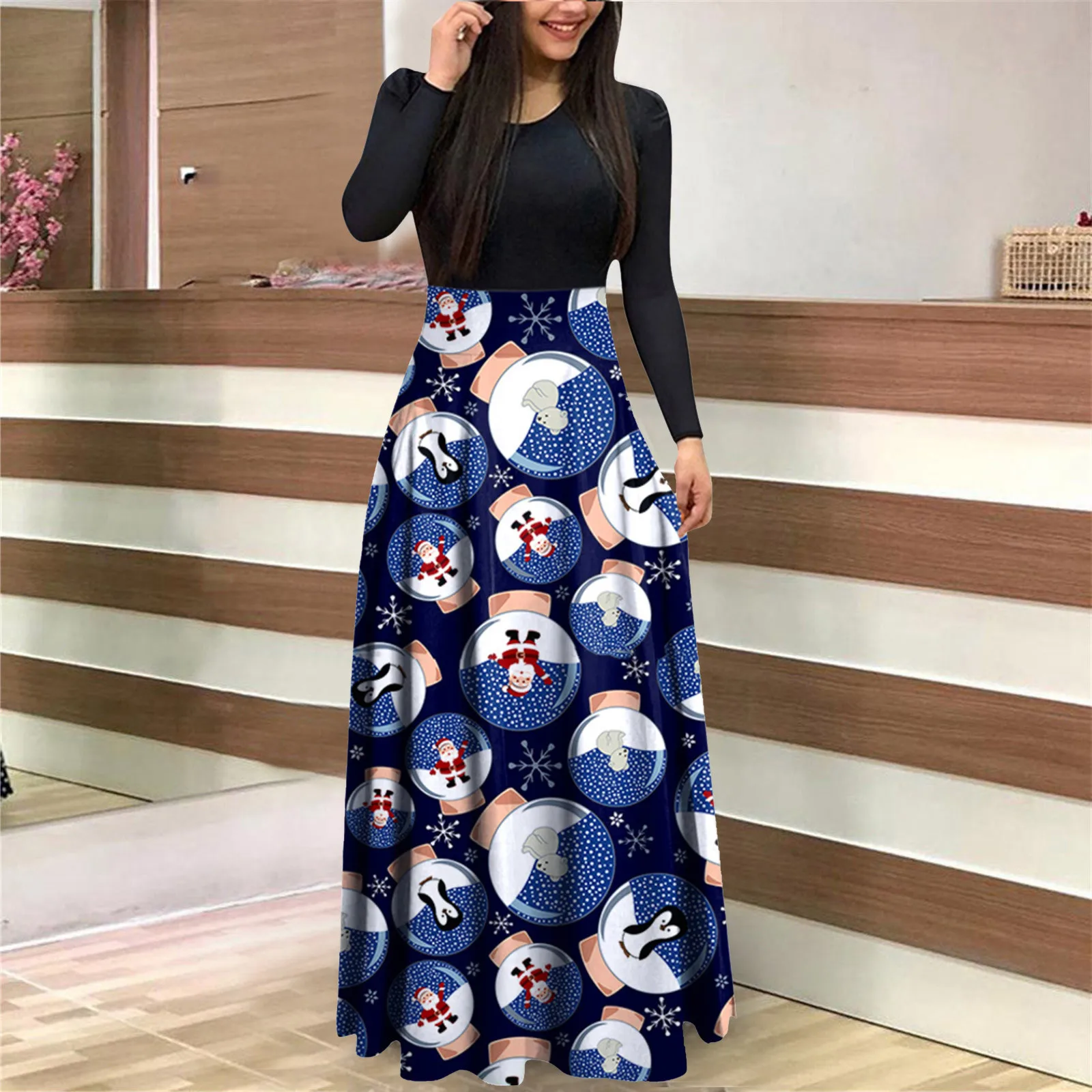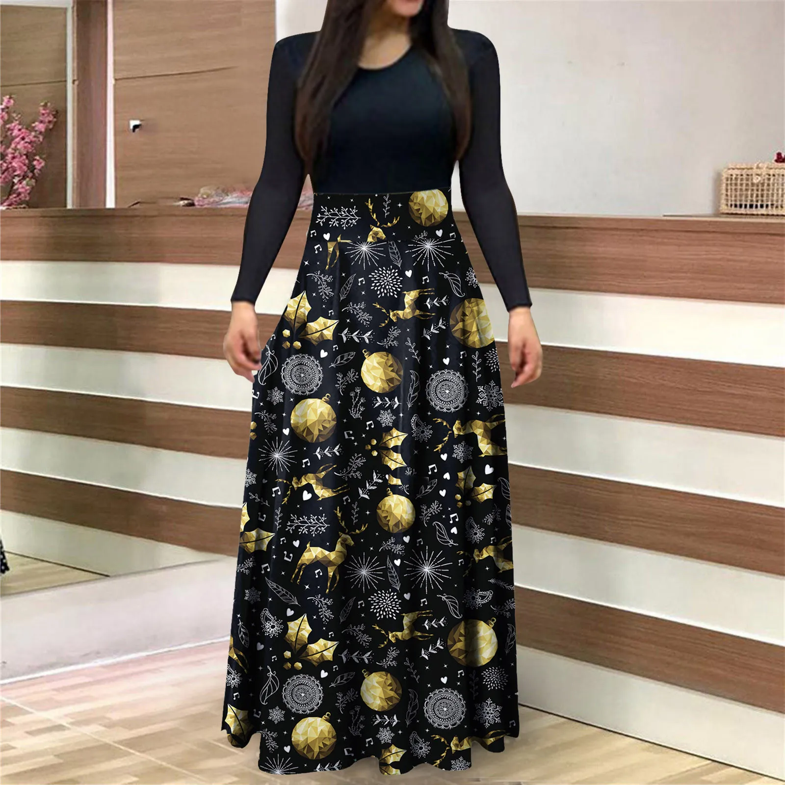 Рождественское платье для женщин, большие размеры, модное платье с принтом Санта Клауса, оленя, снеговика, длинным рукавом, круглым вырезом, Черное вечернее, длинное платье на выпускной