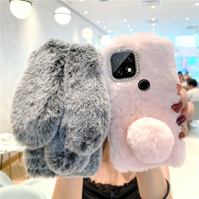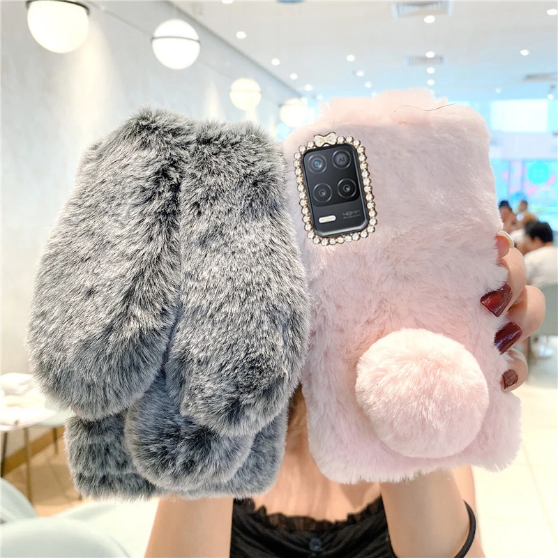 Для Realme 8i чехол Модный мультяшный милый кролик пушистый мех кролик силиконовый чехол для Realme Narzo 30 5G чехол пушистый мех кролика теплый плюшевый силиконовый чехол на Realme GT Neo Бампер для телефона Realme GT Neo 2 2T GT 2 Pro Чехлы для Realme C21Y C21 теплый чехол силиконовый защитный бампер для телефона Realme GT Realme 9i мобильный телефон Сумки.