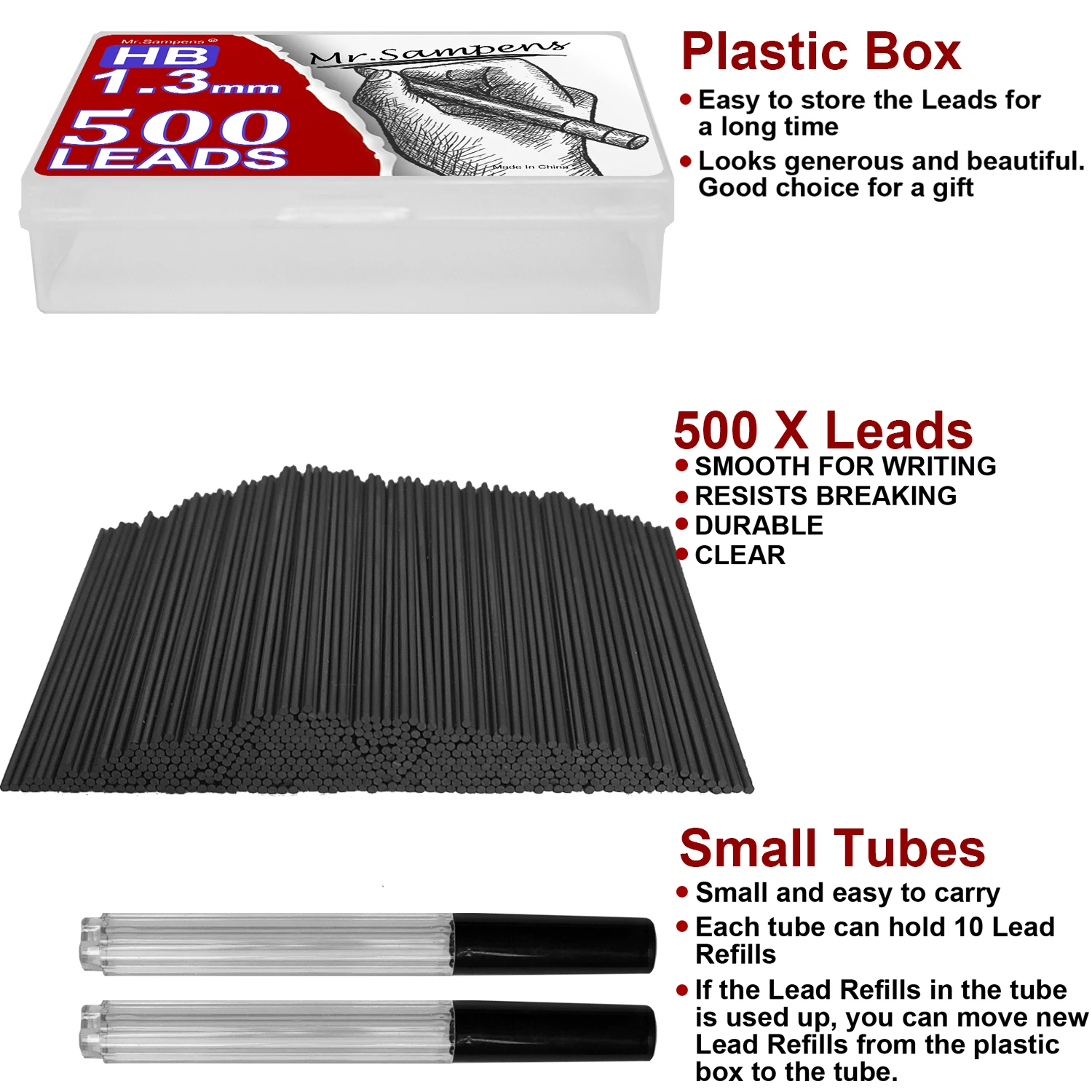 2. 500 механических карандашей в одной пластиковой коробке. Поставляются с 2 удобными трубками для переноски.