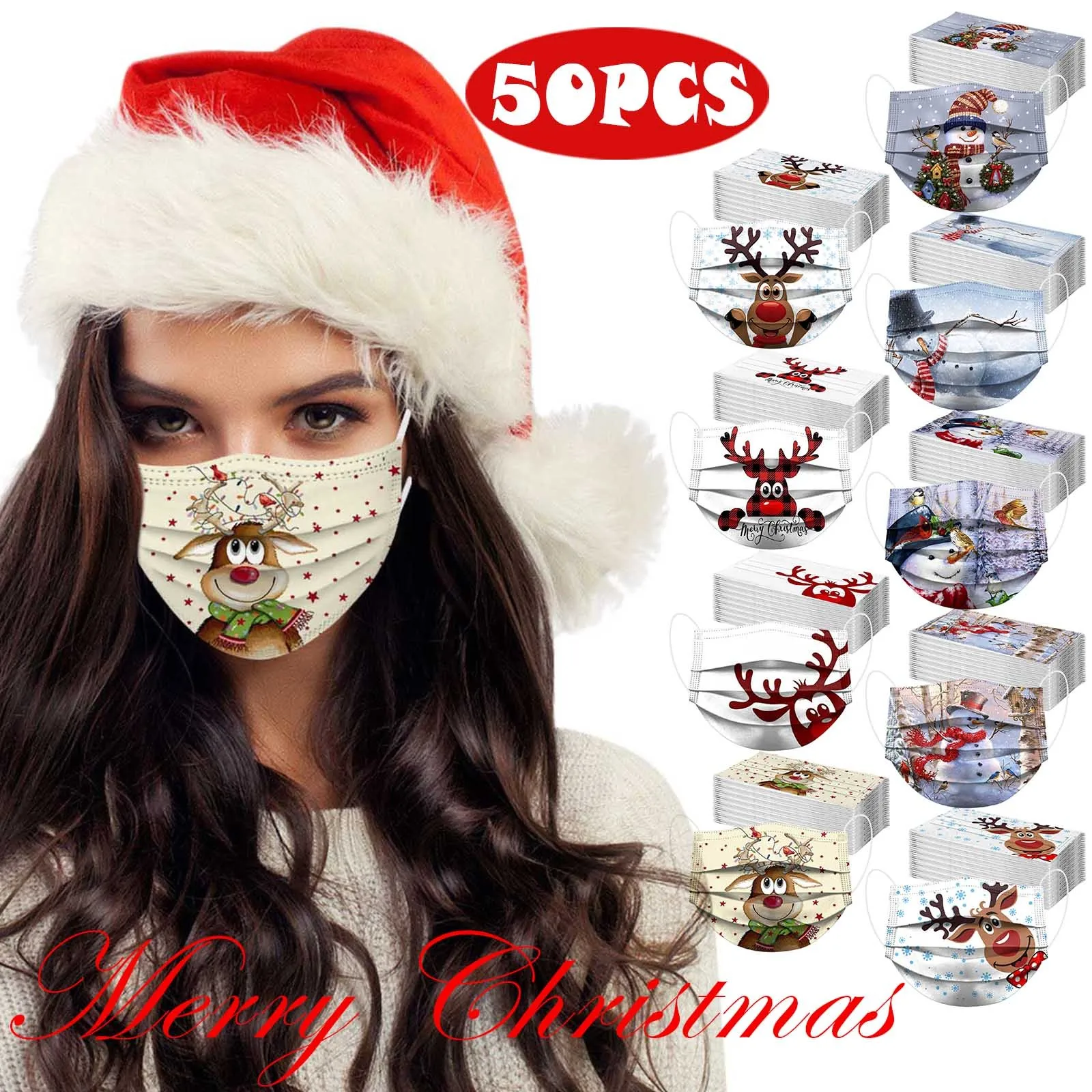 50 шт.ВзрослыеСчастливого Рождества мульти-принты дышащая 3-Слои одноразовые маски