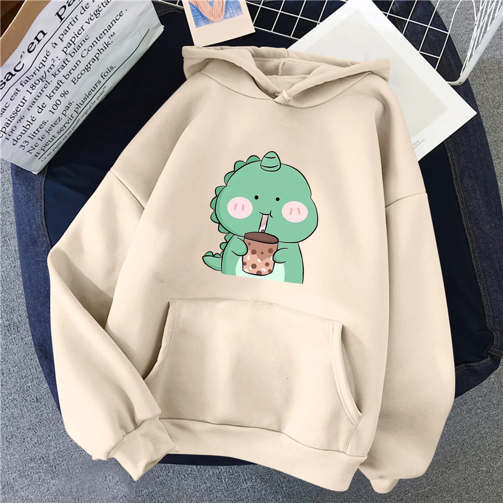 Толстовка женская с капюшоном, милый свитшот с мультяшным принтом динозавра в Корейском стиле, флисовый теплый спортивный костюм с длинным рукавом, пуловер с капюшоном
