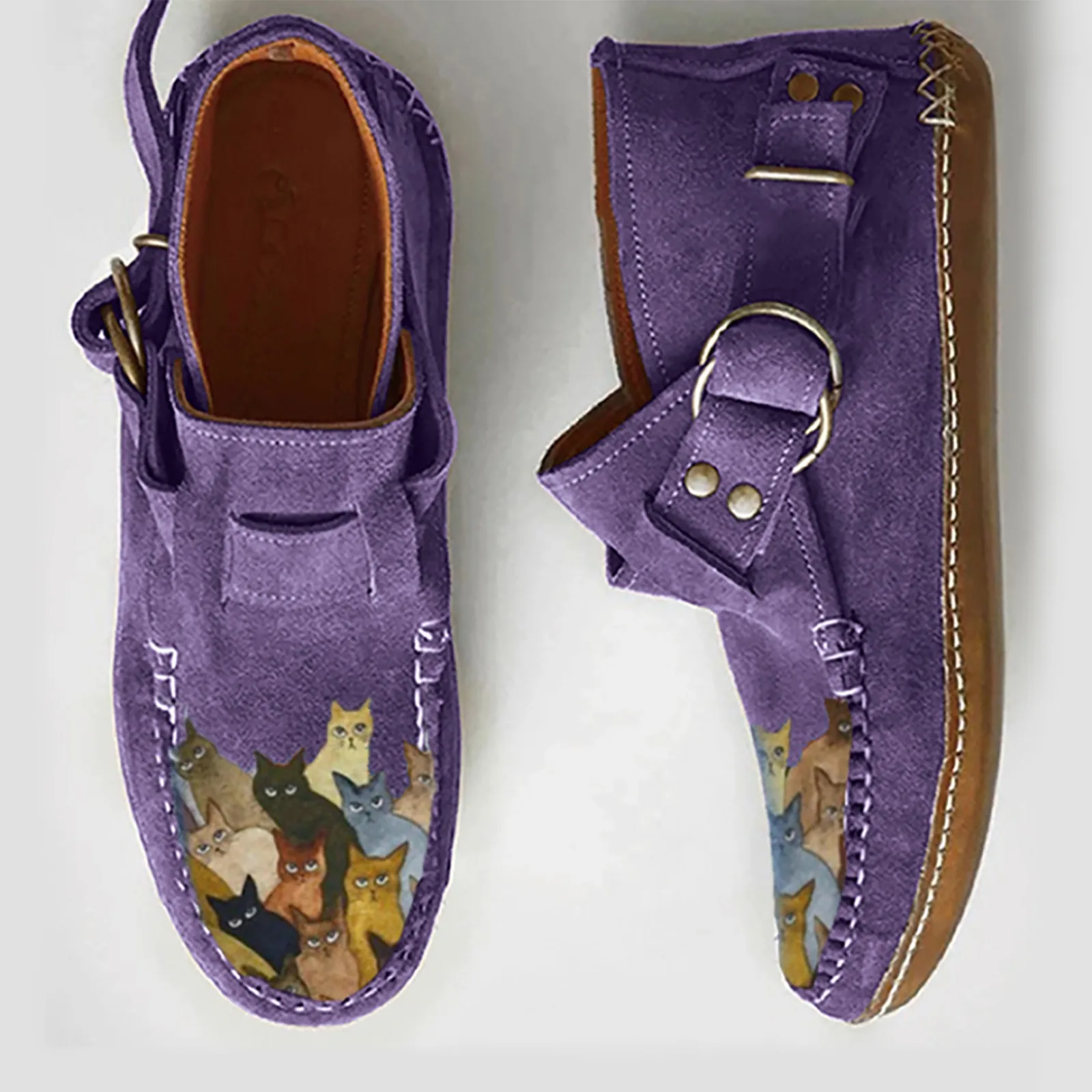 Женские ботинки с круглым носком, повседневные холщовые туфли на высоком каблуке, высокие, с ремешком, с рисунком кошки
