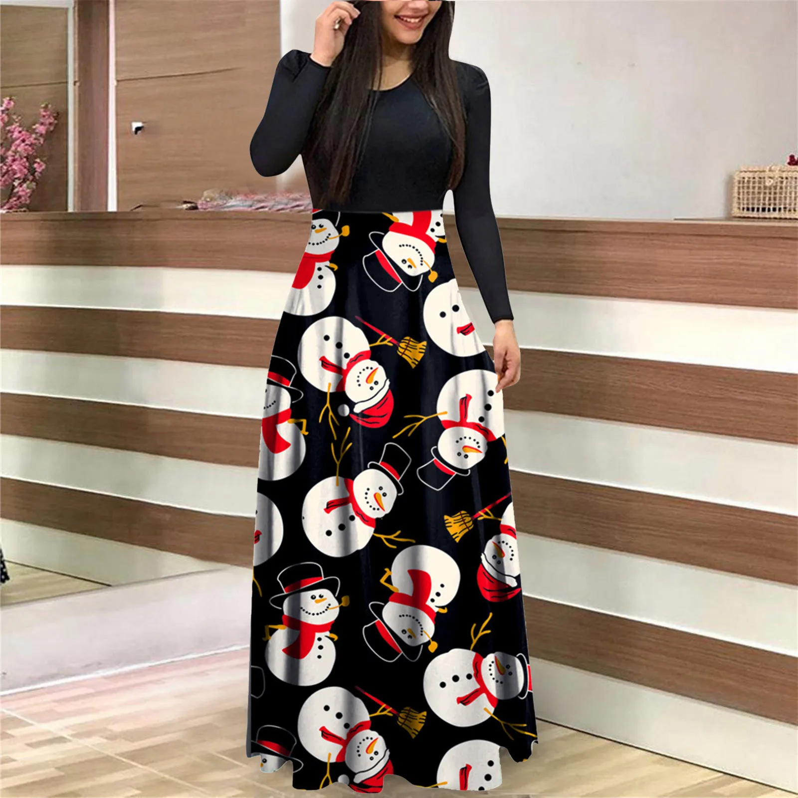 Осенне-зимнее женское Платье макси с рождественским принтом, рождественские платья макси с длинным рукавом, женское повседневное осеннее длинное платье А-силуэта для вечерние НКИ и клуба