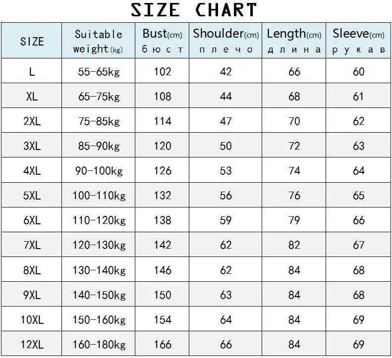 SizeL,XL,XXL,XXXL,XXXXL,5XL,6XL,7XL,8XL,9XL,10XL,12xL