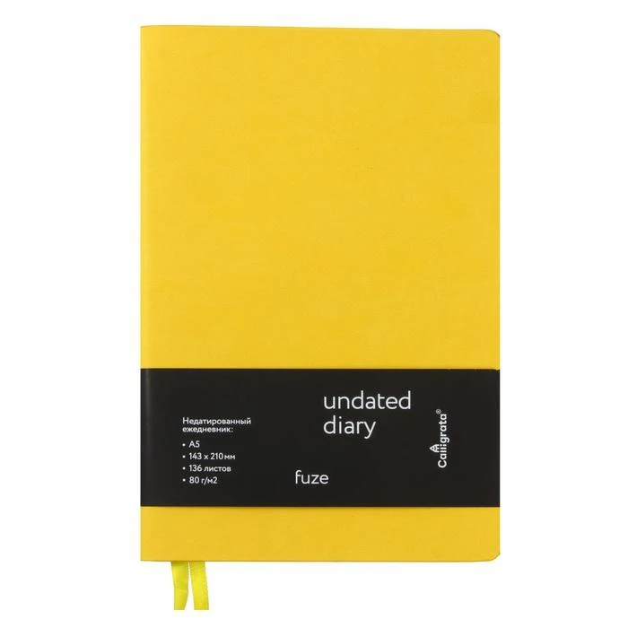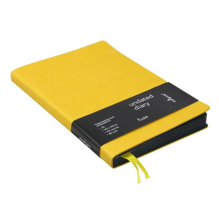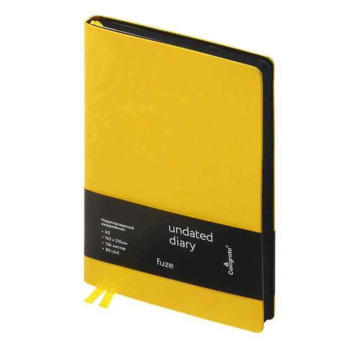 Ежедневник недатированный формат A5, 136 листов в клетку, кожзам желтый Fuze, черный срез, 2 ляссе, перфорированные уголки