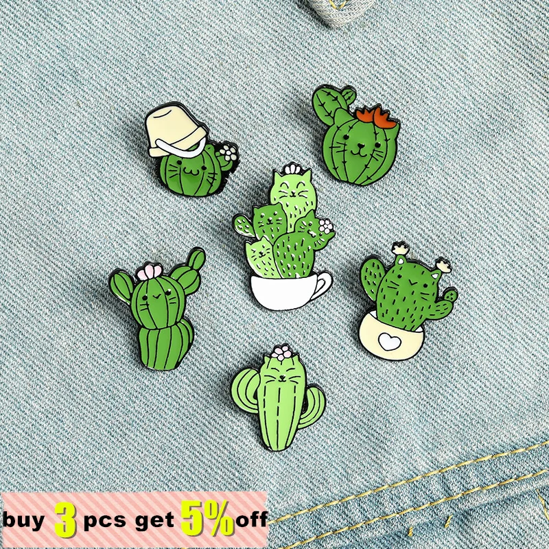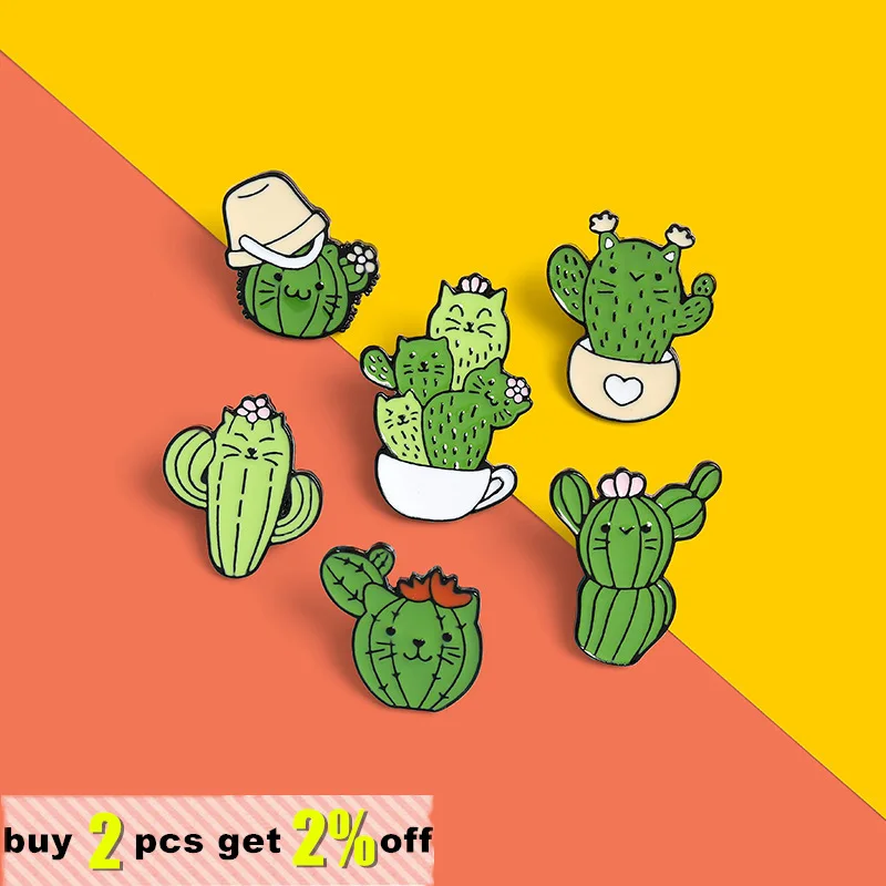 Эмалированные булавки с изображением милого кактуса кота и зеленых ...