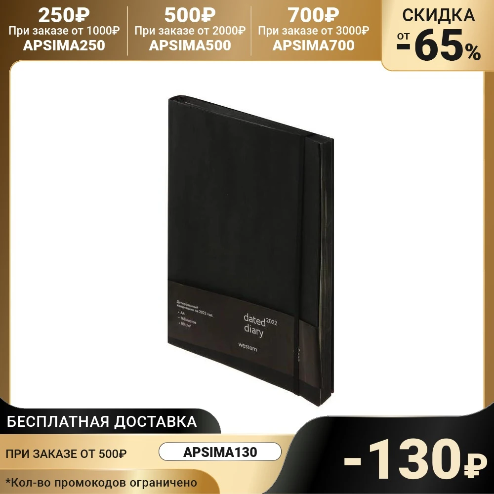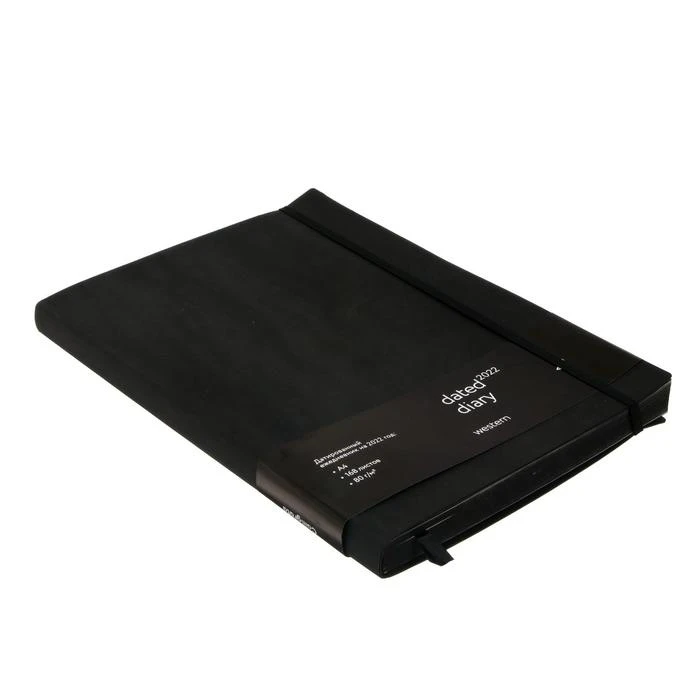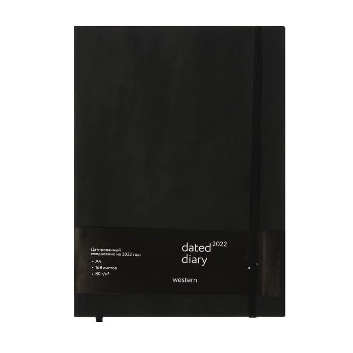 Ежедневник датированный 2022 год, формат A4, 168 листов в линейку, кожзам черный Western, черный срез, с резинкой, 2 ляссе, пе
