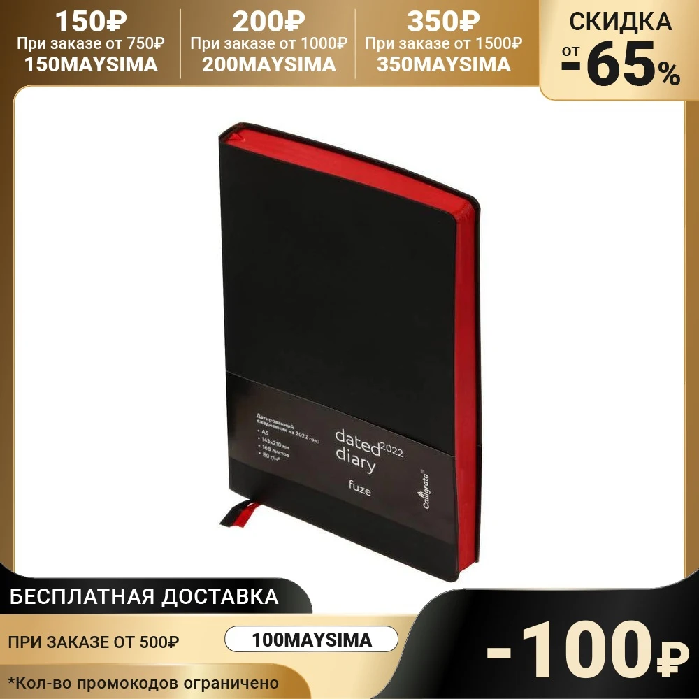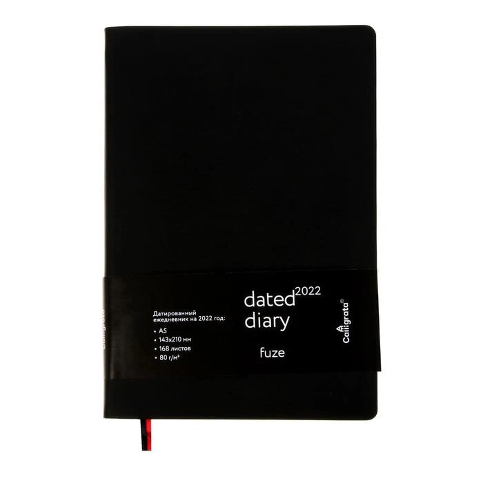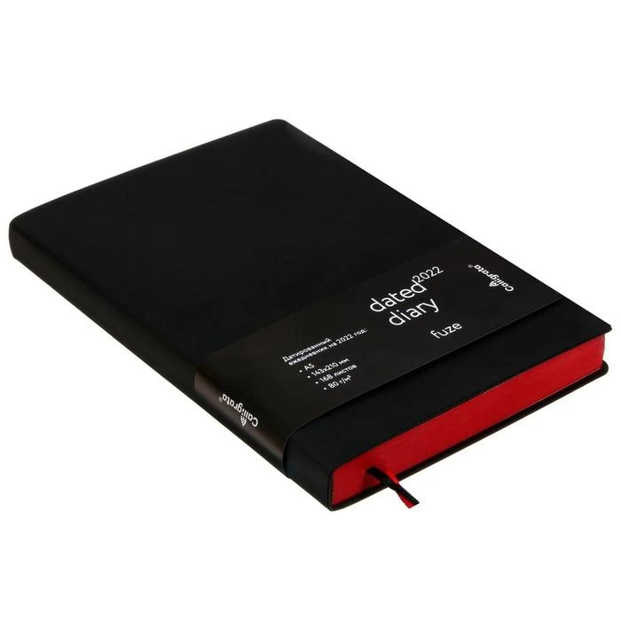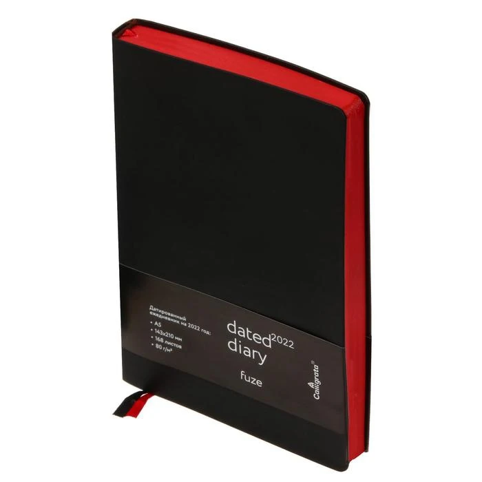 Ежедневник датированный 2022 год, формат A5, 168 листов в линейку, кожзам черный Fuze, красный срез, 2 ляссе, перфорированные