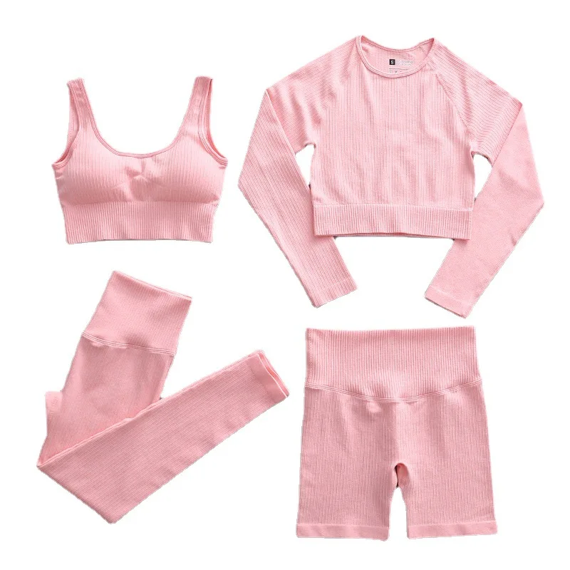 Комплект для йоги из 4 предметов, бесшовный Комплект Фитнес в рубчик, топ для тренировок, Женский комплект нижнего белья, модный спортивный костюм для бега для женщин 2021