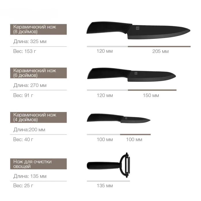 Набор кухонных ножей Xiaomi Huo Hou изготовлен не из обычной керамики, а из современной циркониевой керамики с использованием циркония путем прессования, шлифования и шлифования. В отличие от металлических ножей, они не переносят ионы металла в продукты питания, что является экологически чистым. Ножи не нужно мыть и полировать.