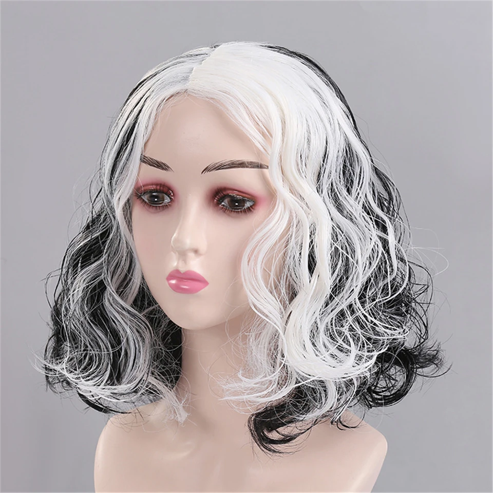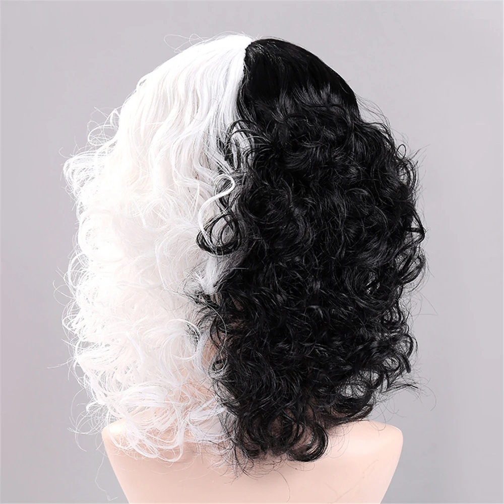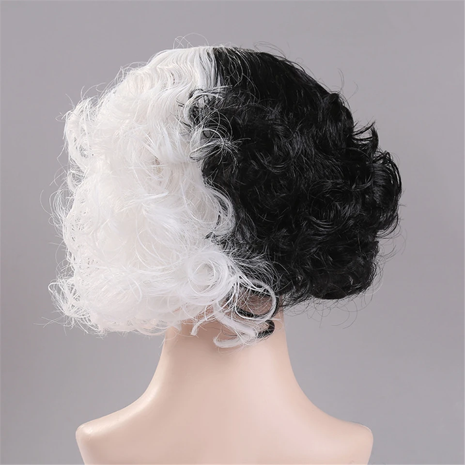 Бесплатная маска! Женский парик Cruella на Хэллоуин для детей и взрослых, парик для косплея с героями мультфильмов, причудливый головной убор для девочек, наполовину черный, половина белых, вьющихся волос