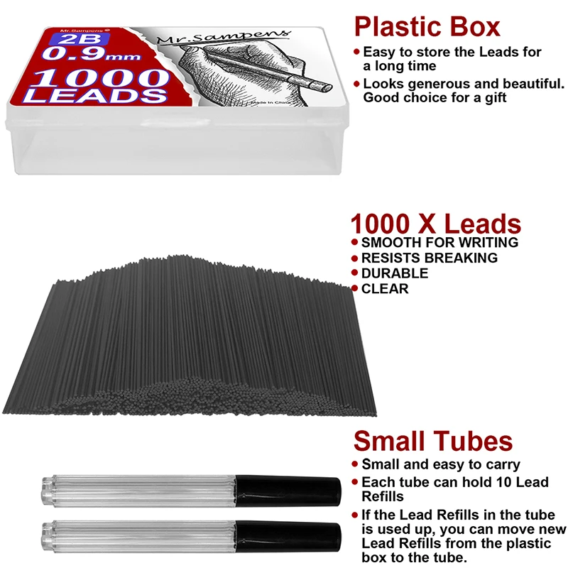 2. 1000 механический грифель для карандашей в одной пластиковой коробке. Поставляется с 2 удобными трубками для переноски.