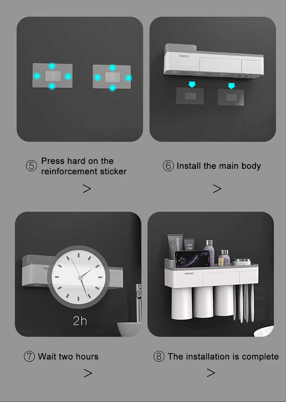 3. Мы постоянно стремимся к качеству продукции. Настенный держатель для зубных щеток изготовлен из АБС-материала, нетоксичный, безвкусный и экологически чистый.