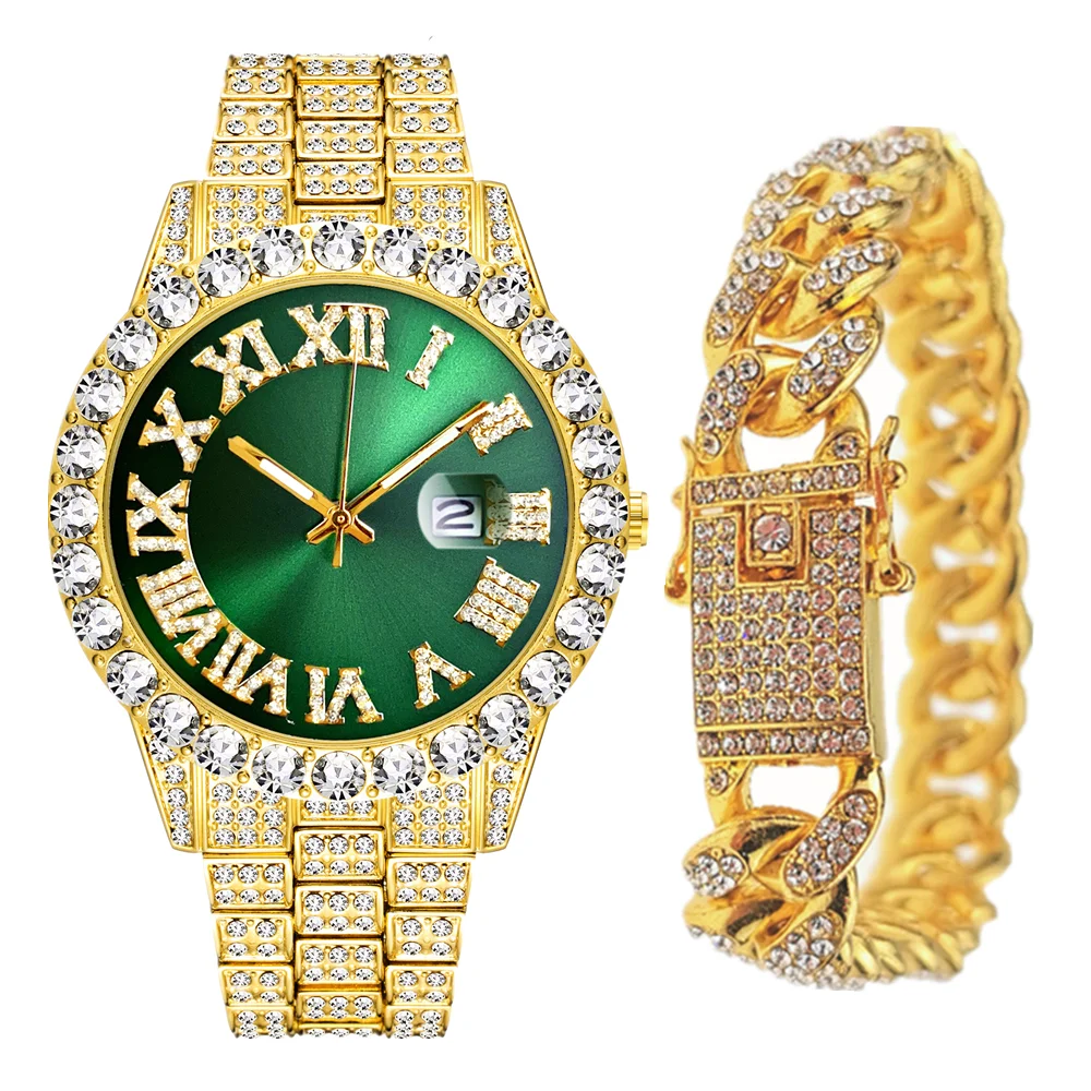 Часы наручные Майами мужскиеженские с блестящим браслетом из кубинской цепи, роскошные золотистые с зеленым водным призраком в стиле хип-хоп, комплект