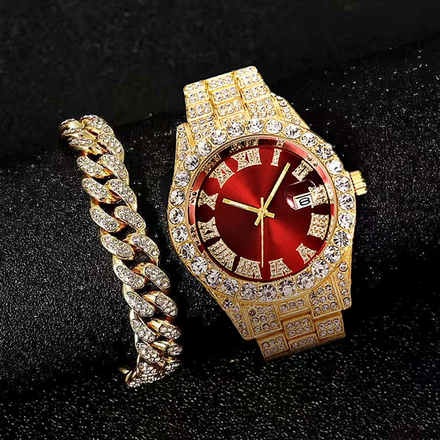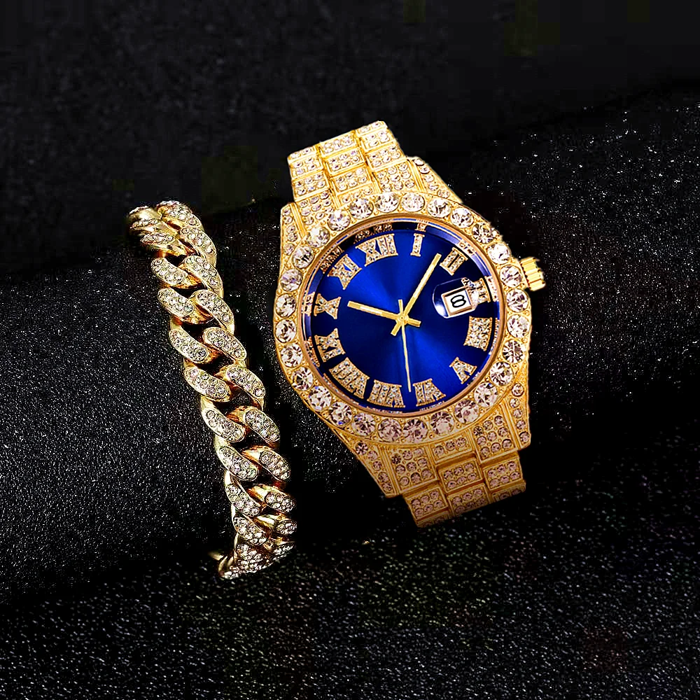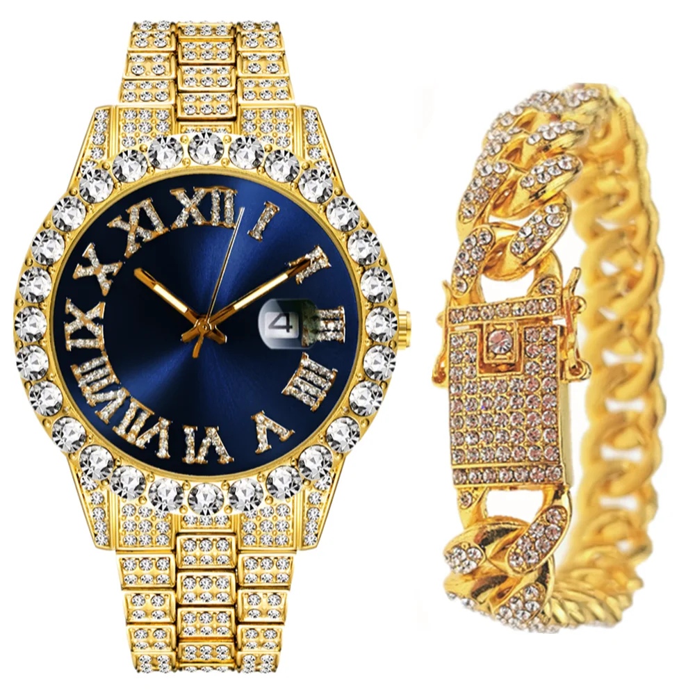 Мужские часы с браслетом и цепочкой, золотые часы в стиле хип-хоп