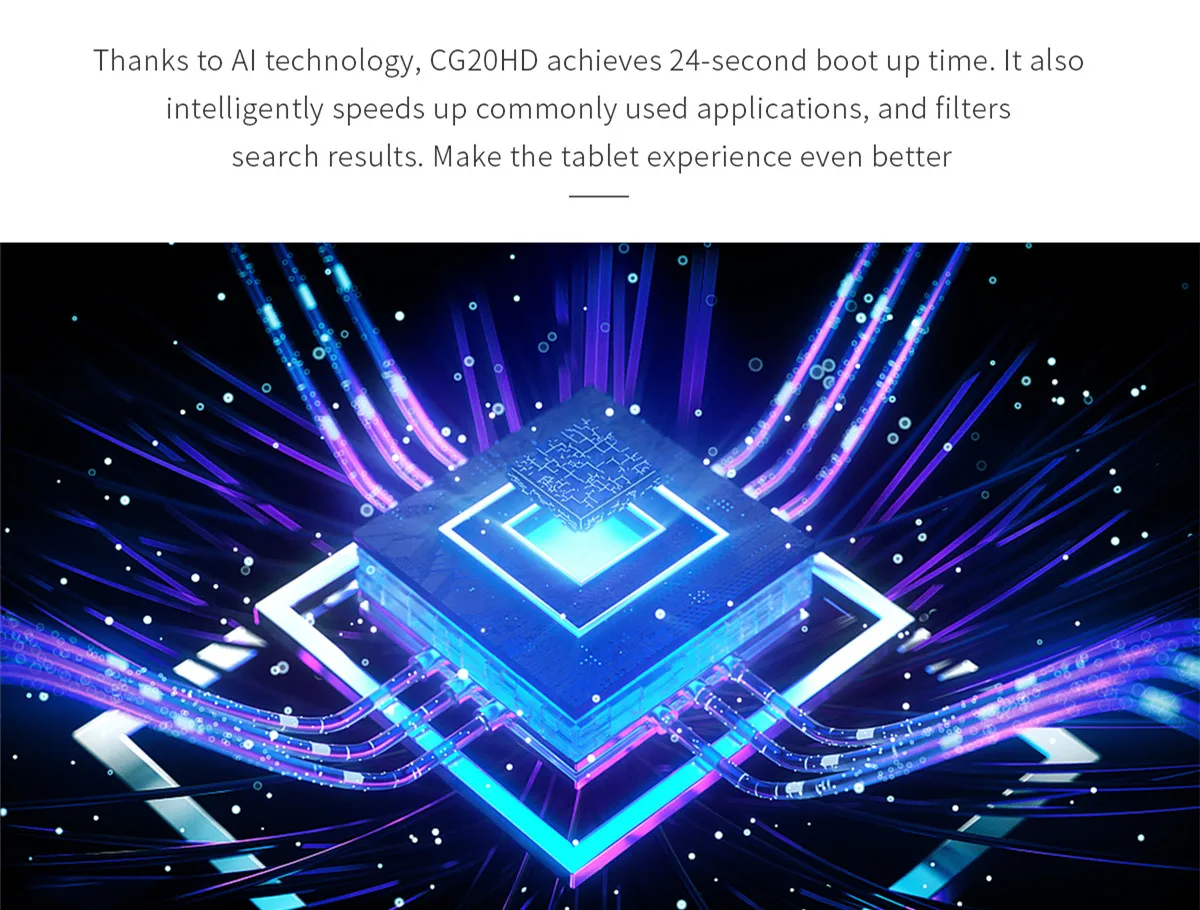 Благодаря технологии AI CG20HD достигает 24-секундной загрузки. Он также разумно ускоряет работу широко используемых приложений и фильтрует результаты поиска. Сделайте планшет еще лучше.