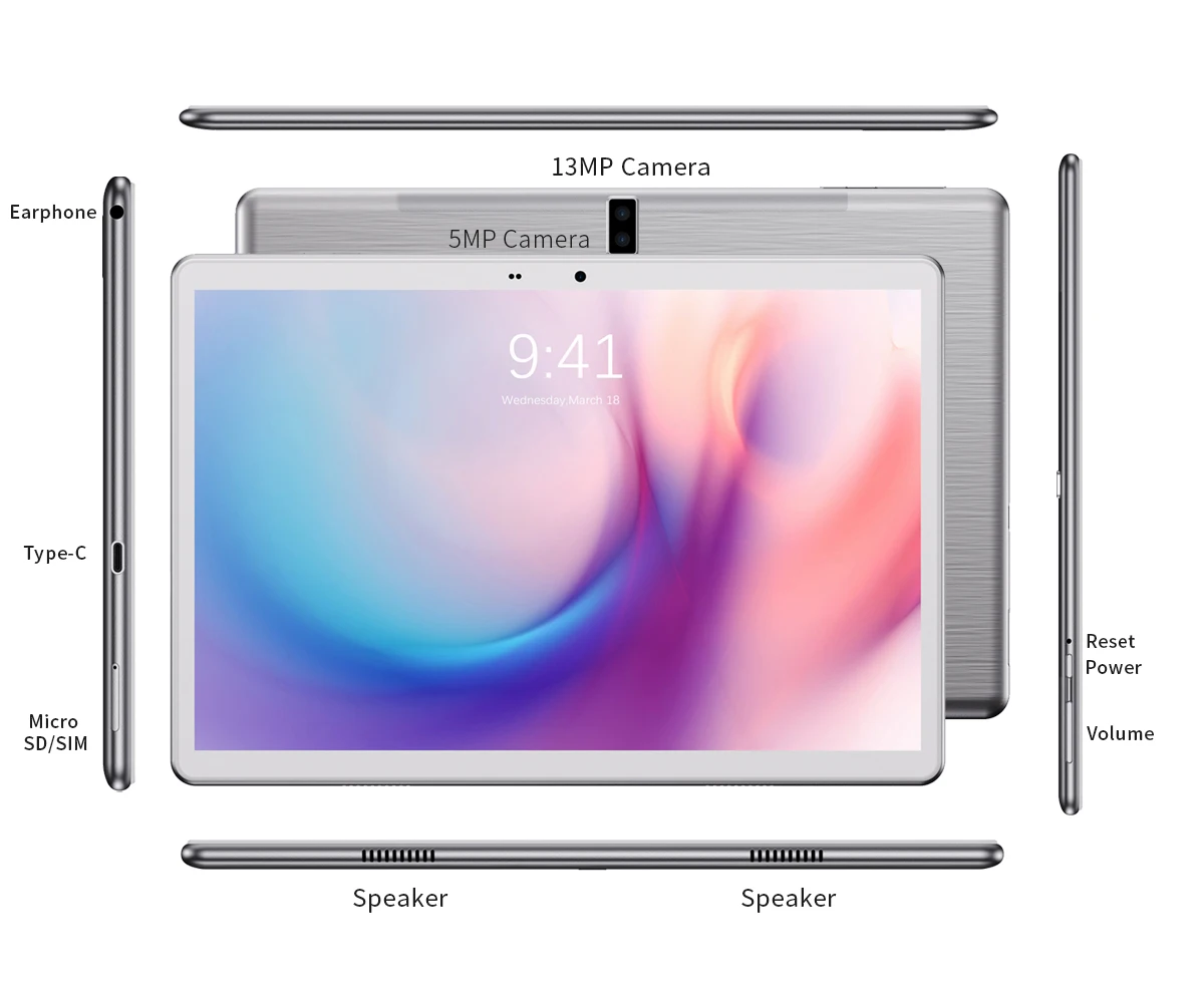 • Операционная система: Android 10,0• Цвет: Золотой/серый/черный (по желанию)• ЦП: SC9863A, восемь ядер• Оперативная память (ОЗУ): 4 ГБ DDR3• Память тела: 64 ГБ Nand-Flash (может использовать емкость меньше этого значения, потому что мобильный телефон пространства программного обеспечения)• Максимальное расширение памяти: MicroSD (TF) 128 ГБ• Материал корпуса: металл + пластиковый корпус• Bluetooth , FM, функция вызова Sim-карты Google Play Adobe Flash• 4G:TDD LTE FDD LTE,• 3G:HSPA + GPRS EDGE;• 2G:GPRS класс 12/EDGEE• GPS: gps-навигация• Поддержка количества SIM-карт: двойная карта, двойной режим ожидания• Размер экрана: 10,1 дюйма• Разрешение экрана: 1920*1200• Сенсорный экран: емкостный экран, Мультитач• Тип экрана: IPS• Камера: задняя 13 миллионов пикселей (со вспышкой), передняя 5 миллионов пикселей• Аудиоформат: поддержка MP3,MP2, AMR,AWB,APE,M4A, MIDI, OGG,WAV,FLAC,3GP (требуется лицензия: AAC, WMA)• Формат видео: поддержка MPEG4-SP, H.264/AVC,H.263,3GP,3G2,MP4,MKV,AVI,WEBM• Формат изображения: Поддержка JPEG, PNG, BMP, GIF и т. Д.• Микрофон: Встроенный микрофон• Интерфейс ввода-вывода: разъем для наушников 3,5 мм, интерфейс TYPE-C, слот для карты TF, 2 слота для SIM-карты• Функция OTG: Поддержка• Wi-Fi: 2,4 ГГц• Версия Bluetooth: 4,2• Встроенные приложения: браузер, электронная почта, видеоплеер, калькулятор, календарь, часы, файловый менеджер, камера, музыка, приложения Google• Язык: японский, корейский, английский, немецкий, французский, русский, испанский, филиппинский, итальянский, магияр, голландский, греческий, турецкий, арабский, тайский, Norsk bokml , Deutsch ,Hrvatski, латвии, литвиу, Нидерланды, словенсина, Романа, Португалия и т. д.